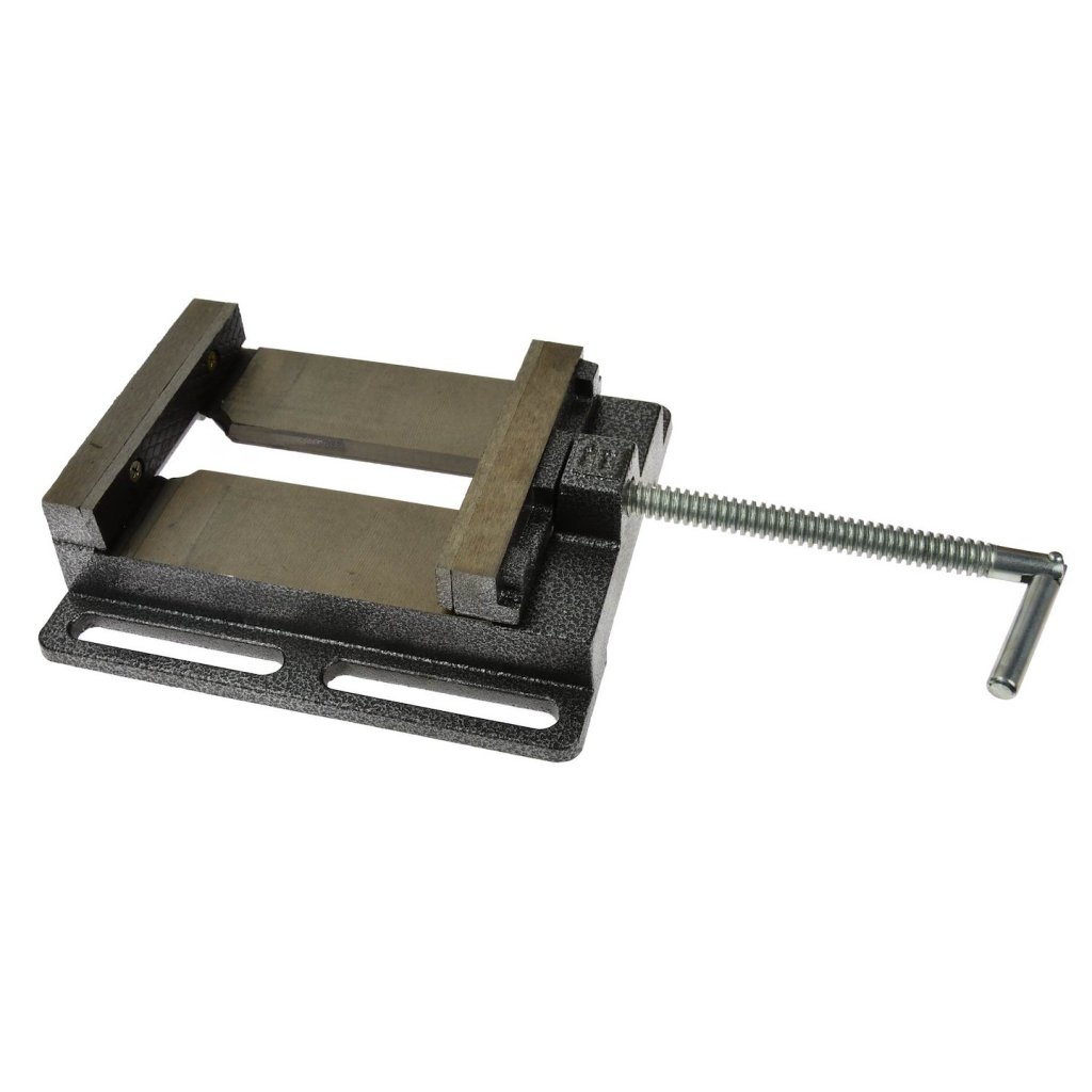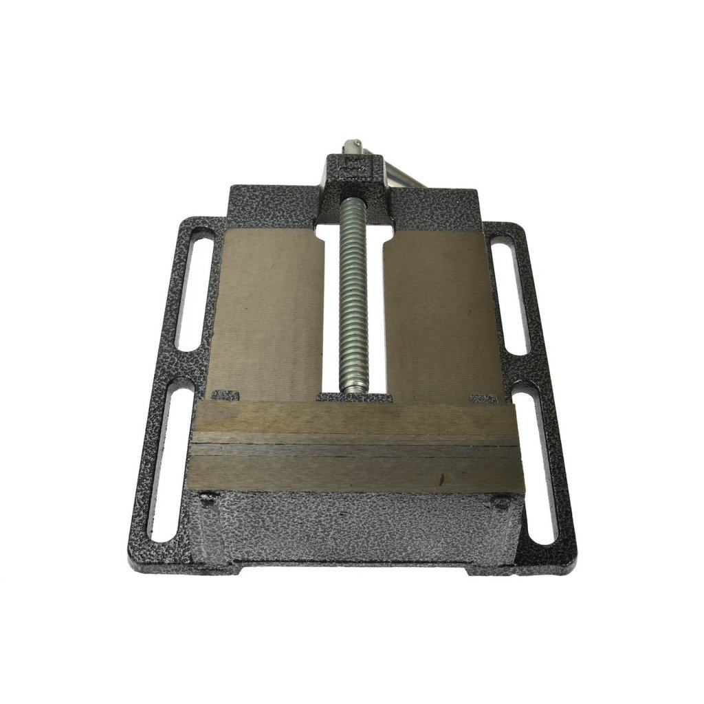 Vrtací svěrák s drážkovanou základnou umožňující snadnou montáž a polohování svěráku. Vyrobeno z litiny s odolnými ocelovými čelistmi s křížovými zářezy.