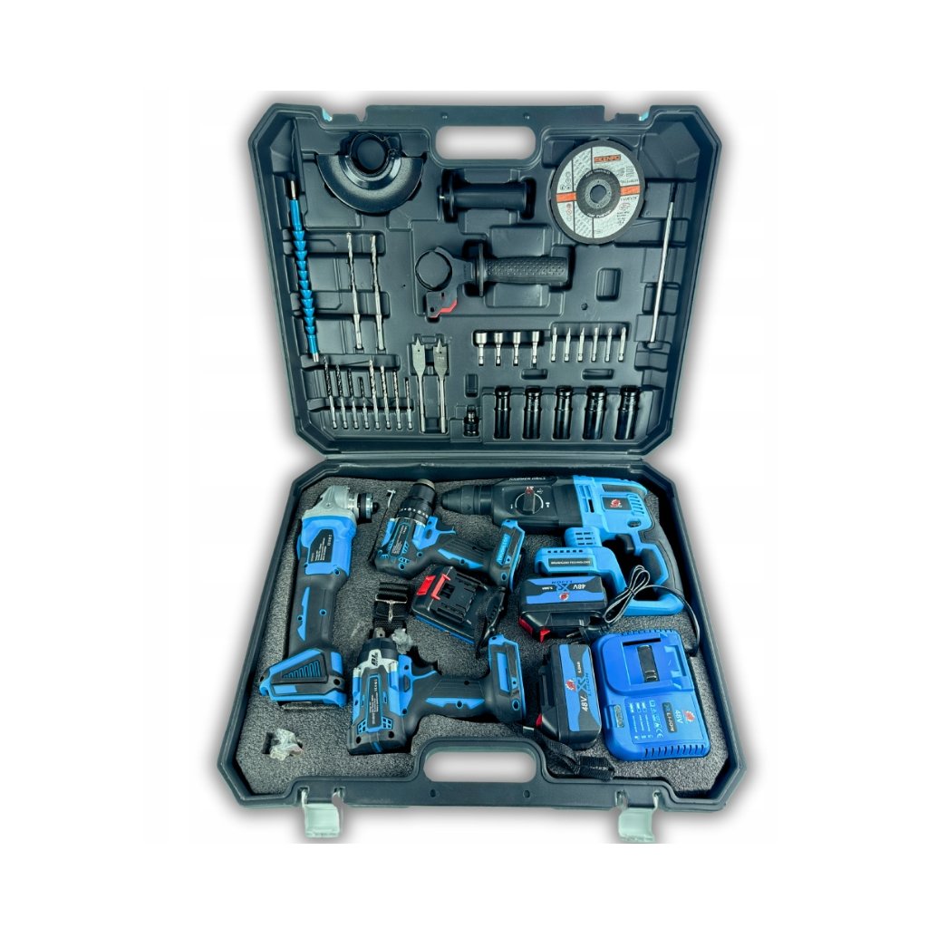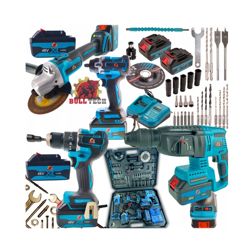 Tato výhodná aku sada kombinuje 4 samostatná zařízení – vrtačku s příklepem, rázový utahovák, úhlovou brusku a příklepové kladivo SDS+. Každý nástroj má vlastní tělo, silný motor, a je napájen výkonnými 24/48 V Li-Ion akumulátory. Ideální volba pro domácí kutily i profesionály!