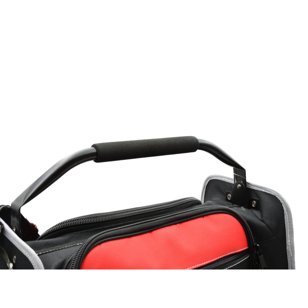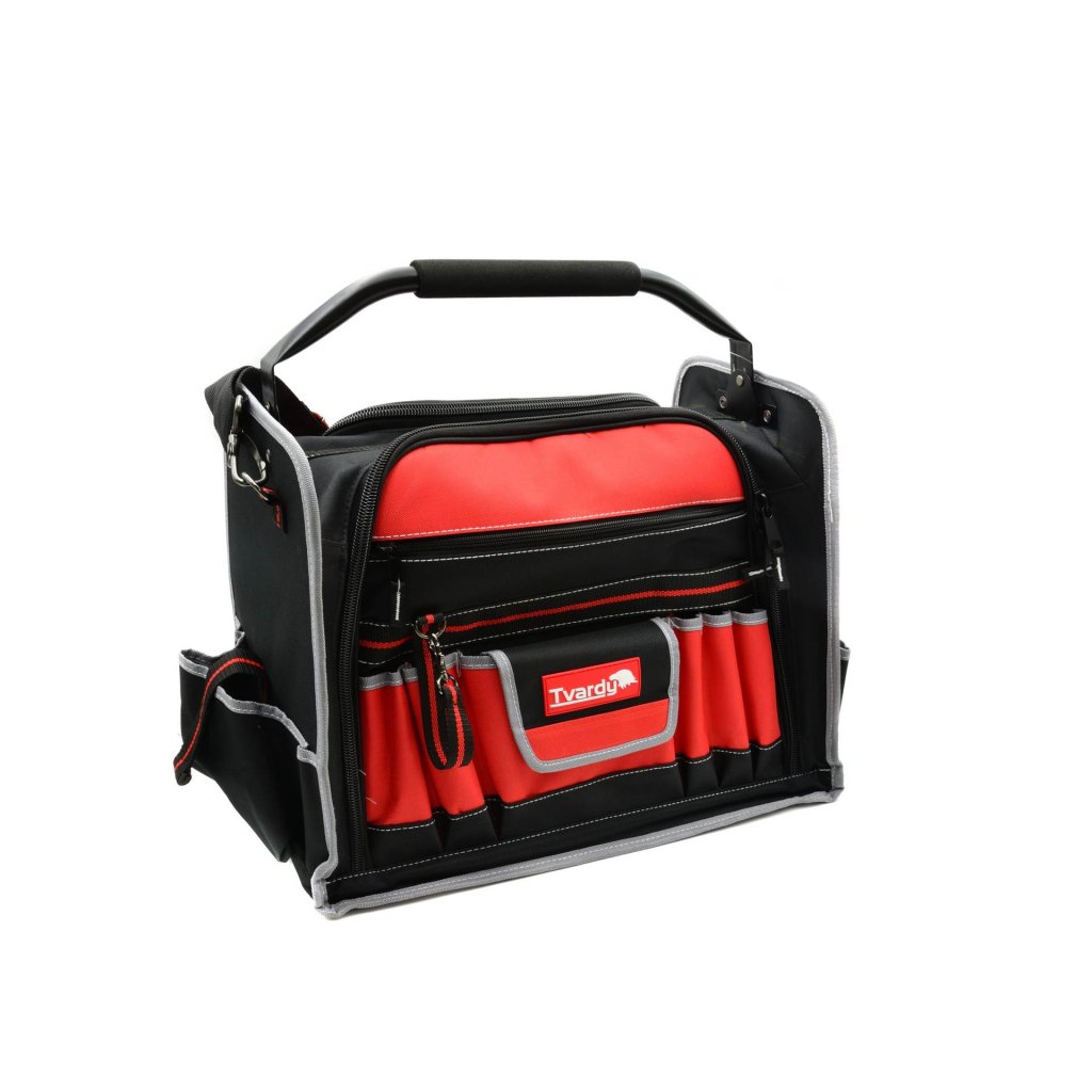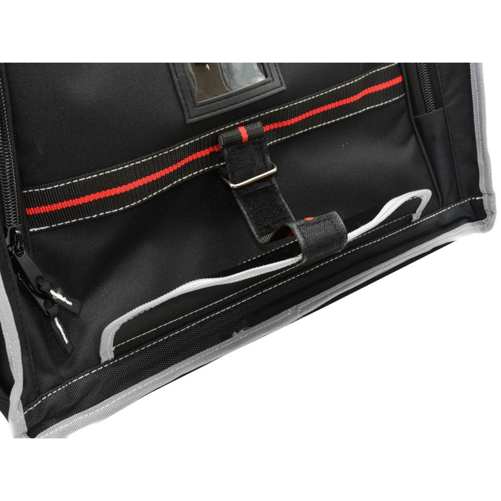 Vlastnosti výrobeku Velký prostor pro nářadí Dvě boční komory vybavené 42 kapsami a úchyty V přední části tašky kapsa na dokumenty se zipem a 6 kapes, z toho jedna se suchým zipem, navíc spona a karab
