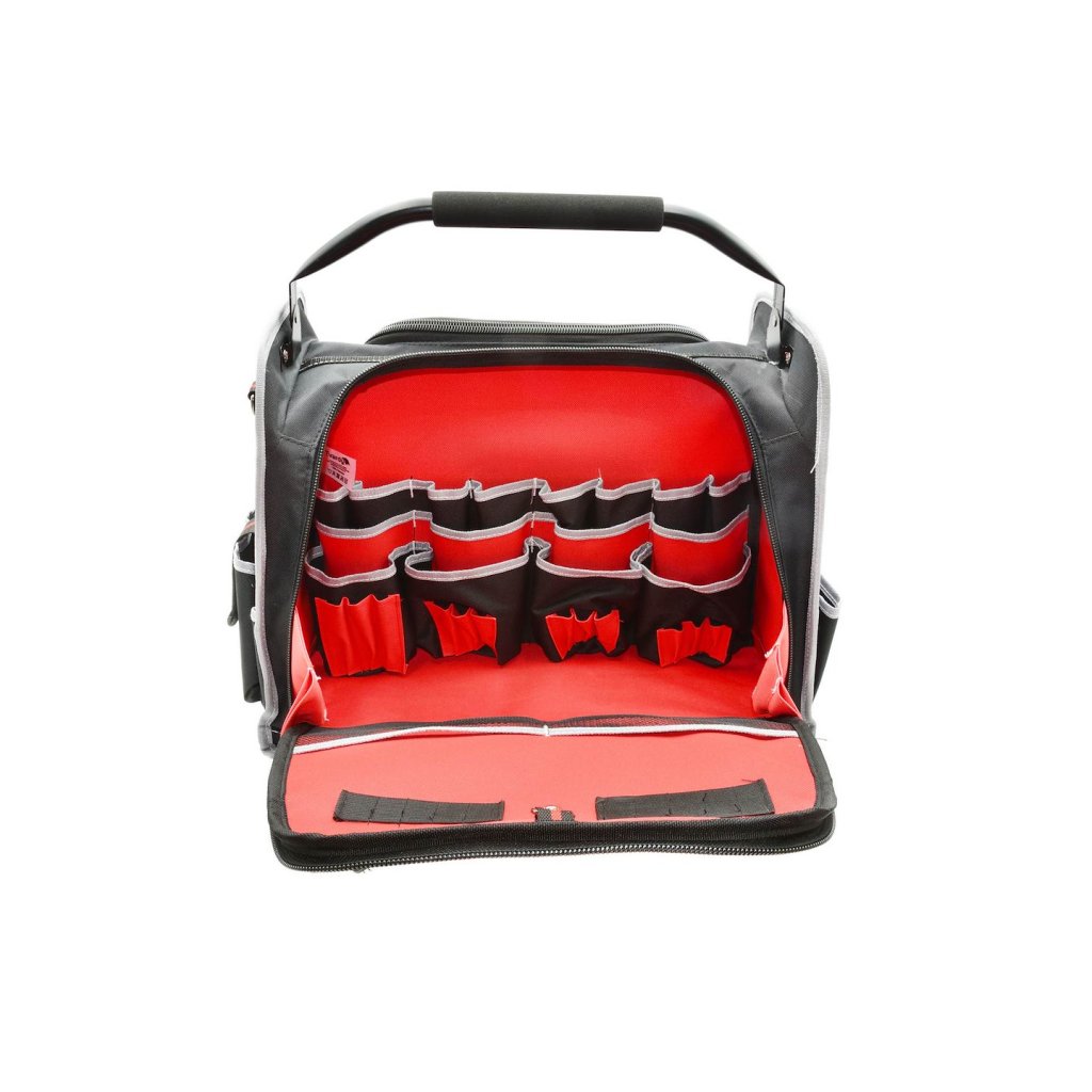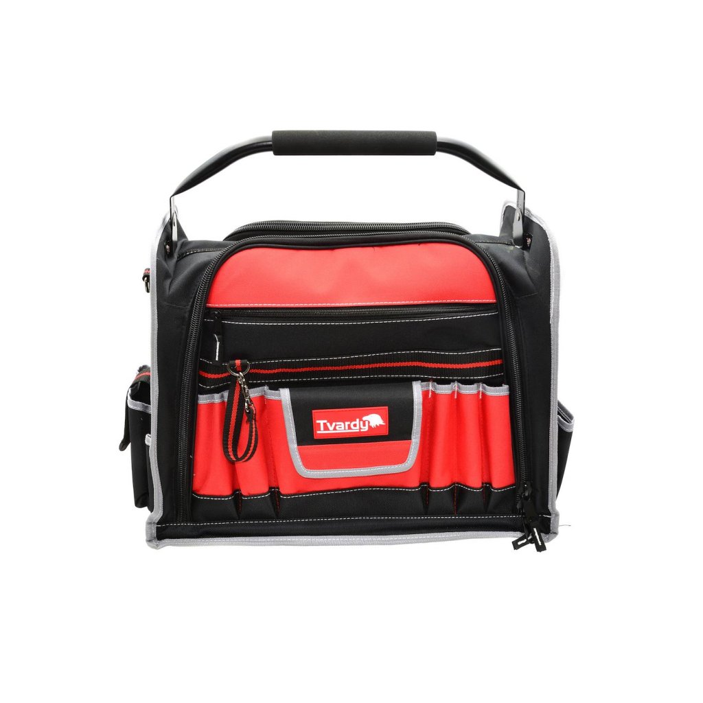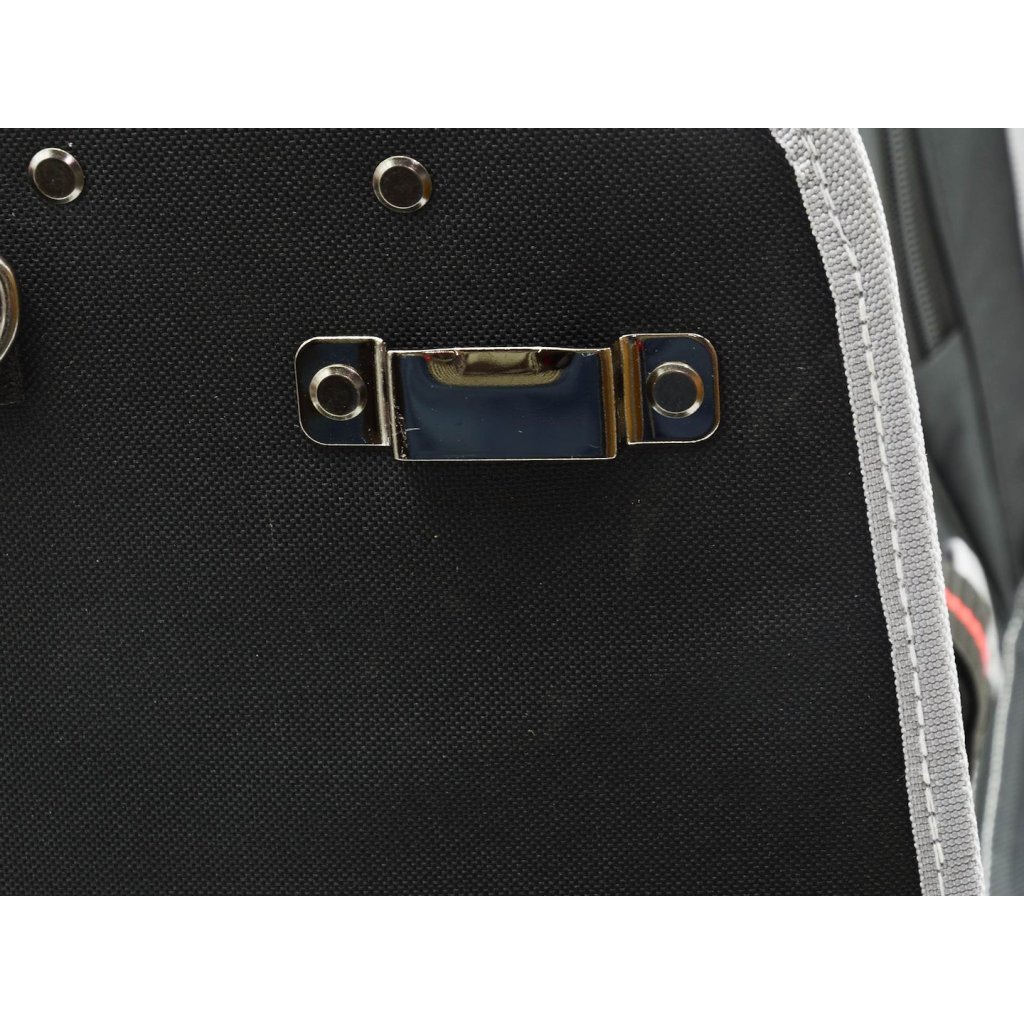 Vlastnosti výrobeku Velký prostor pro nářadí Dvě boční komory vybavené 42 kapsami a úchyty V přední části tašky kapsa na dokumenty se zipem a 6 kapes, z toho jedna se suchým zipem, navíc spona a karab