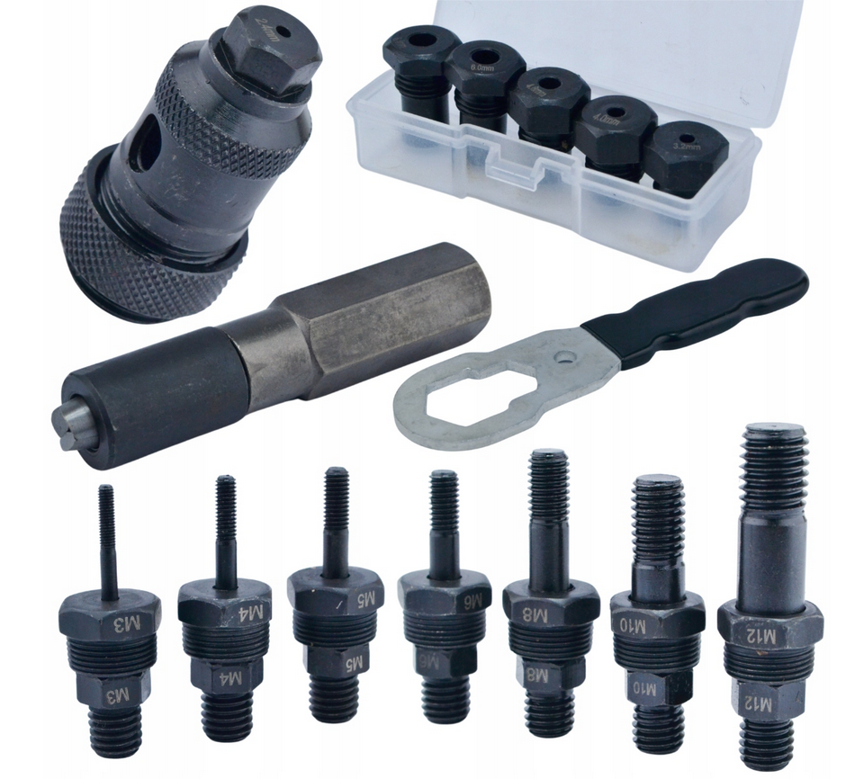 Nýtovací adapter pro nýtovací matice a nýty, 3v1 na vrtačku nebo šroubovák, sada 13 kusů