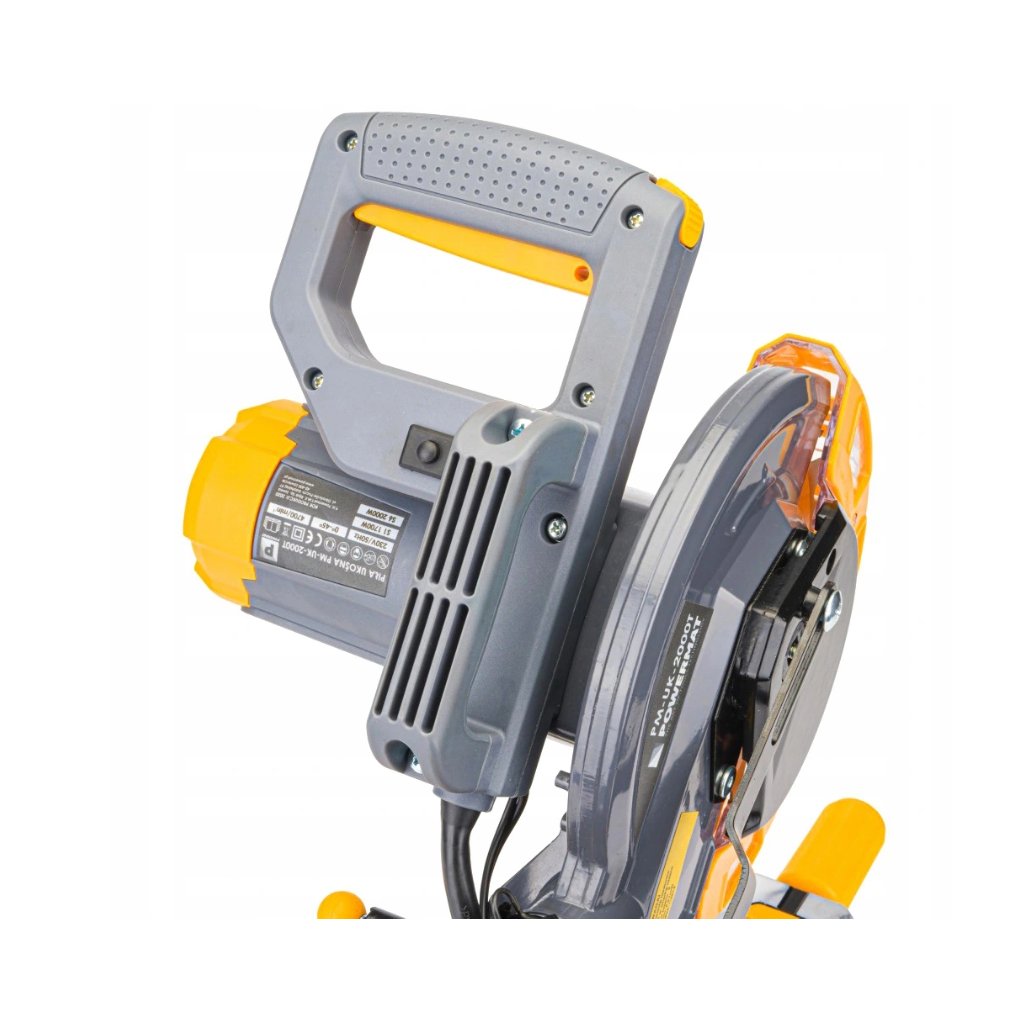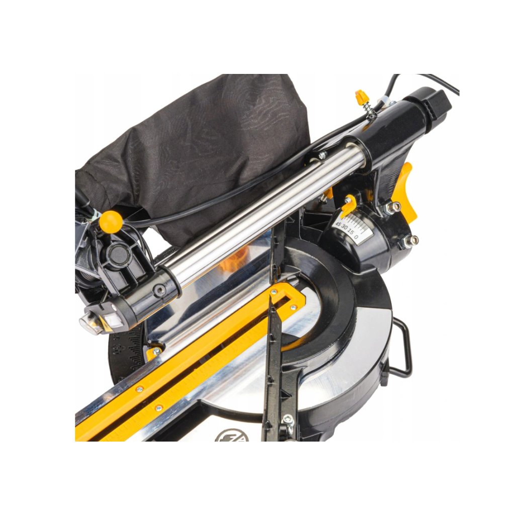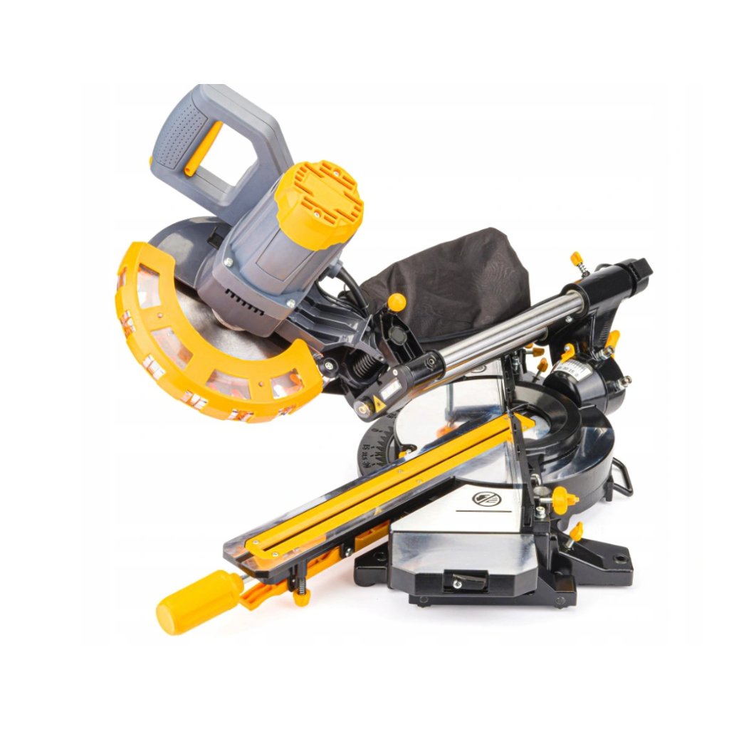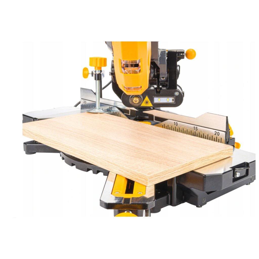Pila byla vybavena trvanlivým motorem s maximálním výkonem 2000W s vyměnitelnými kartáči. Laserové vedení a LED svítidlo, které je nainstalované v přístroji, zvyšuje komfort a přesnost práce s materiálem a díky použití síťového napájení není třeba vyměnit baterie. Otočný stůl s úhlem nastavení a naklápěcím kotoučem s rozsahem nastavení 0 – 45 stupňů. Laserová řezací linka a pracovní lampa s dvojitými LED Přesný indikátor řezu laserem umožňuje vizualizovat místo, kde je objekt umístěn na materiálu. Pracovní lampa vám umožní osvětlit obrobek, čímž se zlepší komfort práce. Funkce posuvu, hloubkový doraz a rukojeť na přepravu zařízení Pila má funkci posuvu, která umožňuje obrábění širokých prvků. Nastavitelná hloubková zarážka dává možnost vytvořit drážky. Lehký a kompaktní model, jehož rozměry umožňují přepravu v jedné ruce díky centrálně umístěné ergonomické rukojeti na přenášení je ideální pro mobilní aplikace. Otočná základna frézy je vybavena úhlovou stupnicí a obálkou s jasným pravítkem Základ je vyroben z tlakového odlitku hliníku, tato konstrukce je odolná vůči deformaci během provozu. Vyfrézovaný povrch pracovní desky poskytuje správný koeficient tření, díky kterému se materiál na pracovním stole nadměrně neklouzal. Posuvné stolní prodloužení s plynule nastavitelnými dorazy Usnadňují práci s delším materiálem, zarážky se používají na blokování materiálu, takže se při práci nepohybují do stran. Vertikální svorka pro držení materiálu Nastavitelná vertikální svorka vám umožní připevnit materiál tak, aby se při řezání nehýbal. Přístroj má dva montážní body, takže můžete upevnit svorku na levé nebo pravé straně zařízení. Uzamčení úhlu naklonění řezné hlavy Velký a pohodlný knoflík usnadňuje rychlou změnu úhlu řezu a jeho účinné blokování. Výška x Šířka řezu: