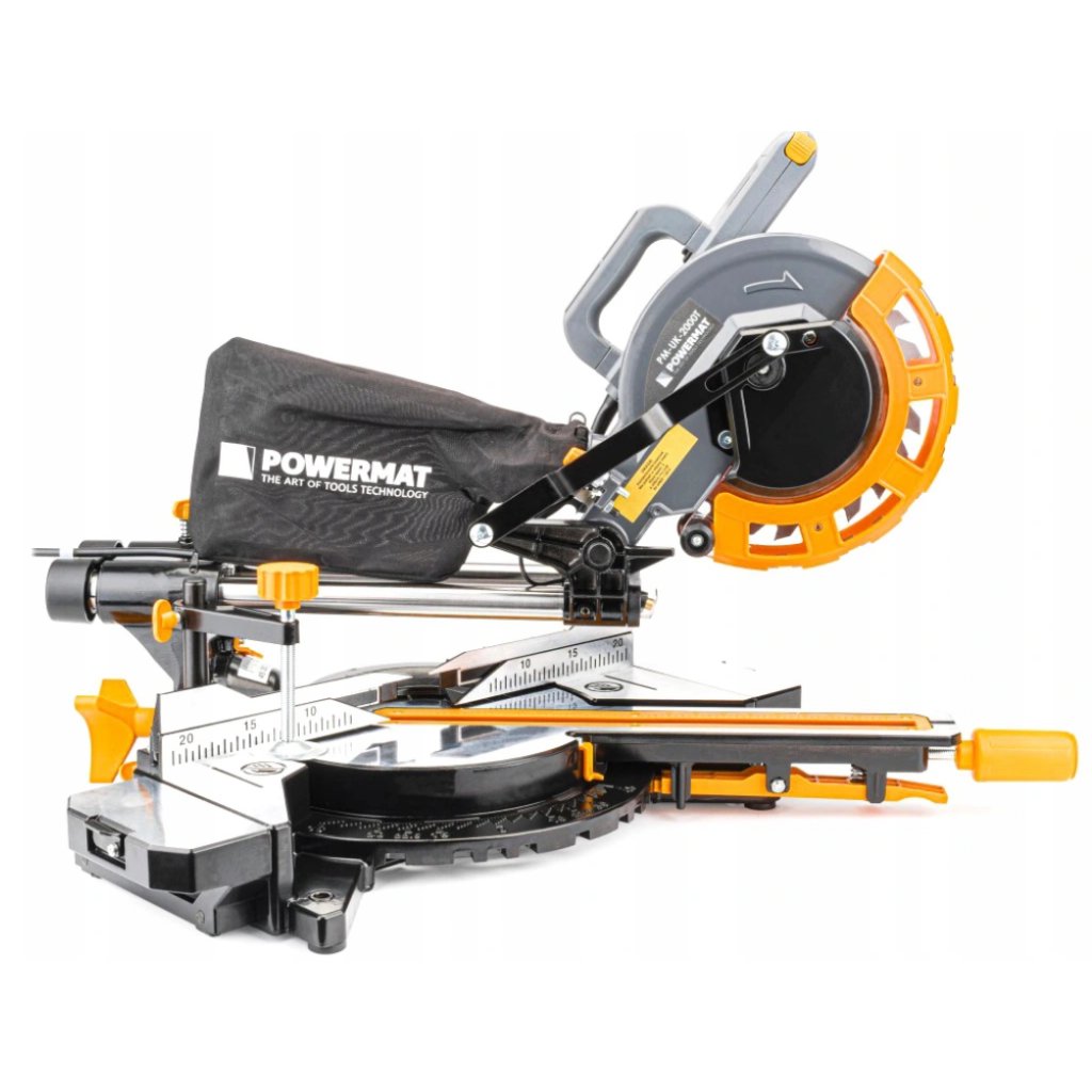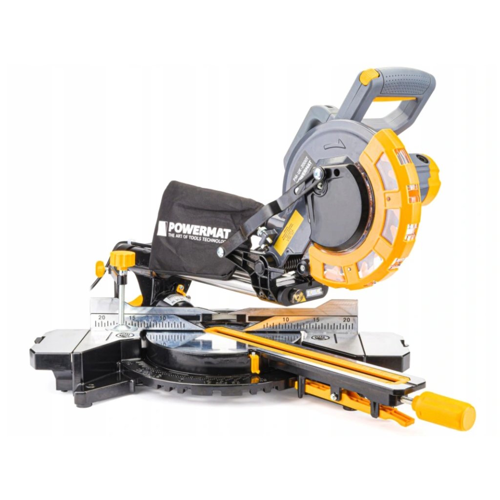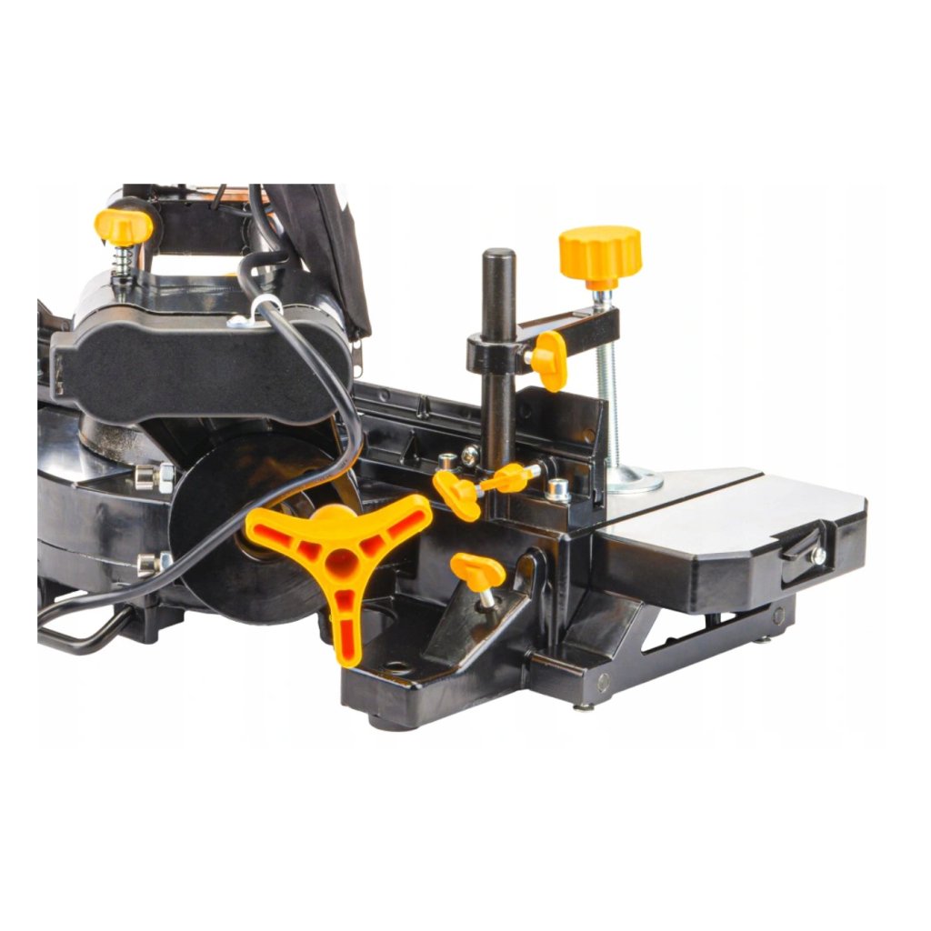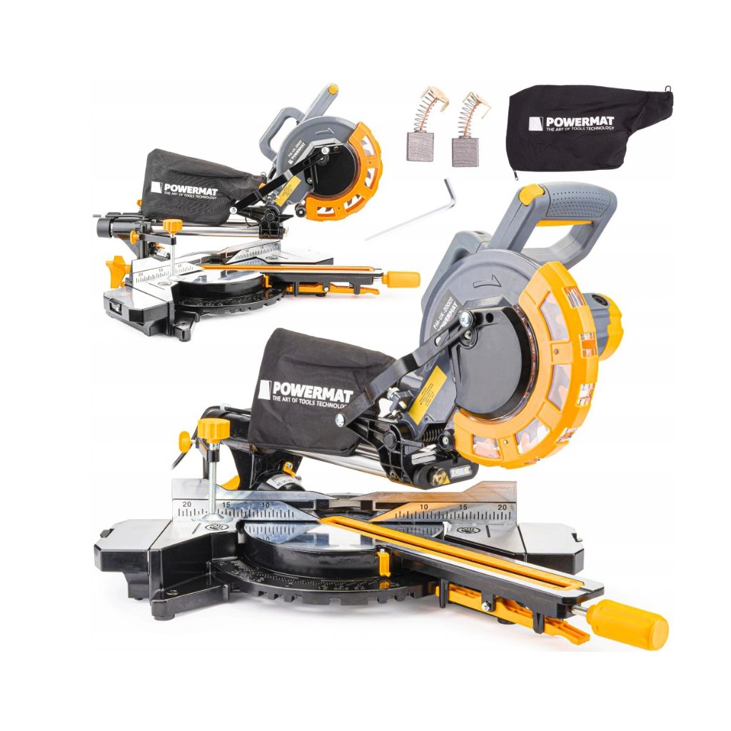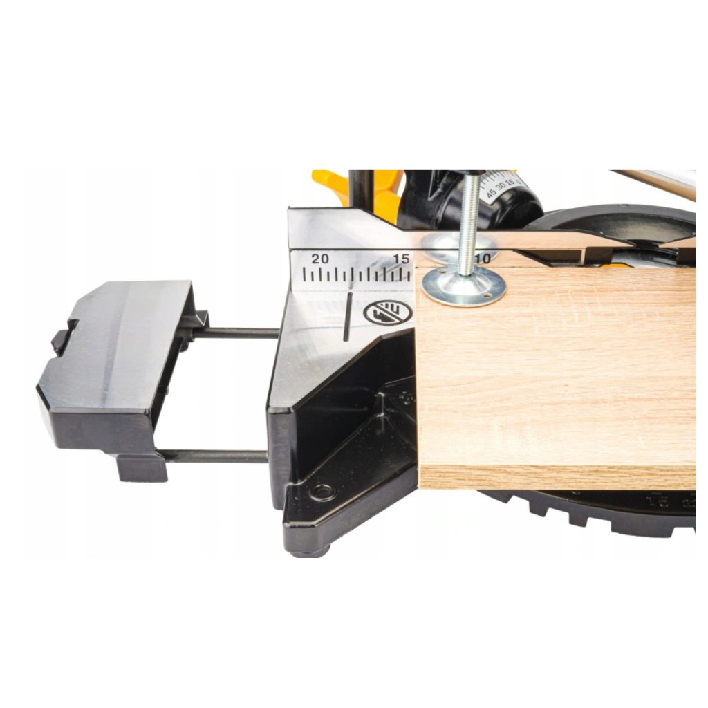 Pila byla vybavena trvanlivým motorem s maximálním výkonem 2000W s vyměnitelnými kartáči. Laserové vedení a LED svítidlo, které je nainstalované v přístroji, zvyšuje komfort a přesnost práce s materiálem a díky použití síťového napájení není třeba vyměnit baterie. Otočný stůl s úhlem nastavení a naklápěcím kotoučem s rozsahem nastavení 0 – 45 stupňů. Laserová řezací linka a pracovní lampa s dvojitými LED Přesný indikátor řezu laserem umožňuje vizualizovat místo, kde je objekt umístěn na materiálu. Pracovní lampa vám umožní osvětlit obrobek, čímž se zlepší komfort práce. Funkce posuvu, hloubkový doraz a rukojeť na přepravu zařízení Pila má funkci posuvu, která umožňuje obrábění širokých prvků. Nastavitelná hloubková zarážka dává možnost vytvořit drážky. Lehký a kompaktní model, jehož rozměry umožňují přepravu v jedné ruce díky centrálně umístěné ergonomické rukojeti na přenášení je ideální pro mobilní aplikace. Otočná základna frézy je vybavena úhlovou stupnicí a obálkou s jasným pravítkem Základ je vyroben z tlakového odlitku hliníku, tato konstrukce je odolná vůči deformaci během provozu. Vyfrézovaný povrch pracovní desky poskytuje správný koeficient tření, díky kterému se materiál na pracovním stole nadměrně neklouzal. Posuvné stolní prodloužení s plynule nastavitelnými dorazy Usnadňují práci s delším materiálem, zarážky se používají na blokování materiálu, takže se při práci nepohybují do stran. Vertikální svorka pro držení materiálu Nastavitelná vertikální svorka vám umožní připevnit materiál tak, aby se při řezání nehýbal. Přístroj má dva montážní body, takže můžete upevnit svorku na levé nebo pravé straně zařízení. Uzamčení úhlu naklonění řezné hlavy Velký a pohodlný knoflík usnadňuje rychlou změnu úhlu řezu a jeho účinné blokování. Výška x Šířka řezu: