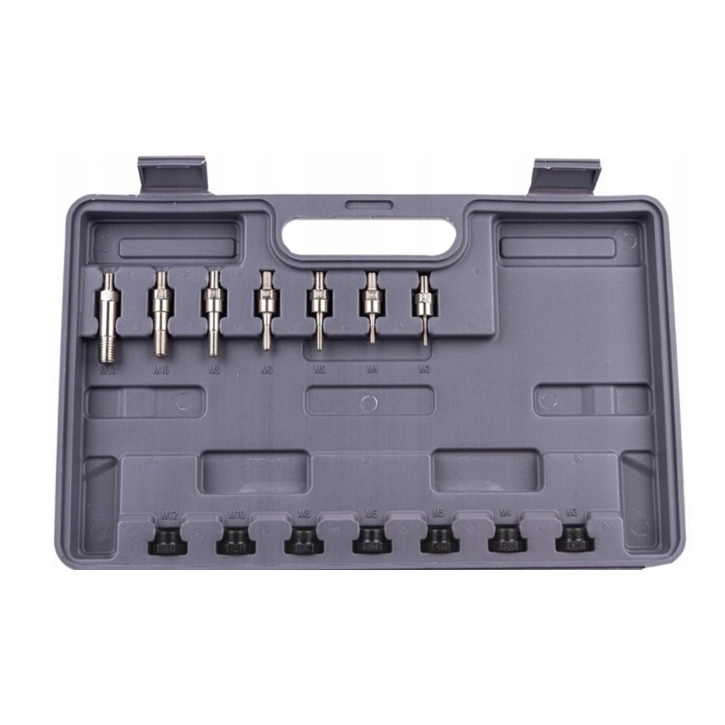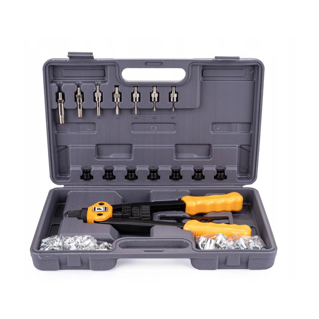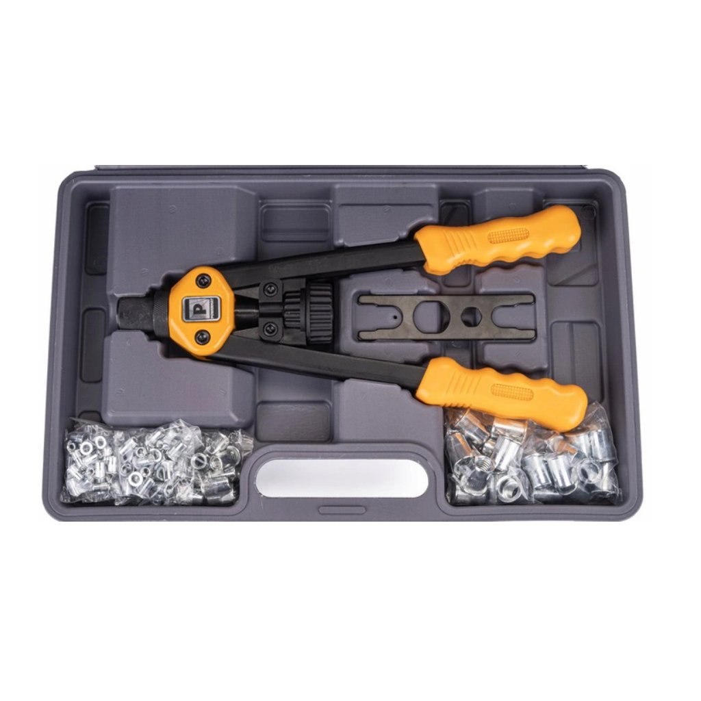 Nástroj pro snadné a efektivní spojování materiálů pomocí nýtůSada obsahuje kleště s pákovým mechanismem, který zajišťuje snadné a silné nýtování, a náboje pro velikosti nýtů od M3 do M12Ideální pro použití v dílnách, opravách a montážních pracích, kde je potřeba rychlé a pevné spojení bez použití šroubů nebo svařováníNevíte si rady