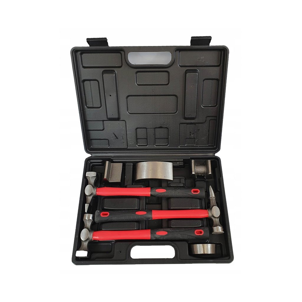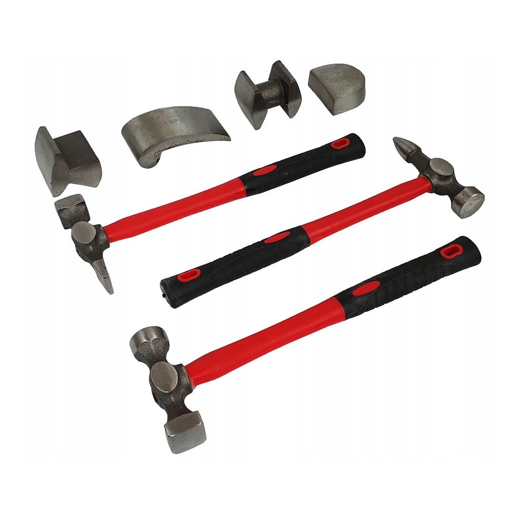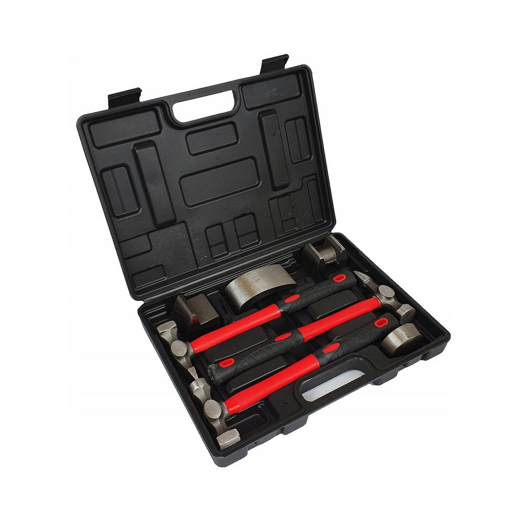 Klempířský set obsahuje 4 kovadliny, 3 kladiva s profilovanou sklolaminátovou rukojetí (dodatečně potaženou pogumováním)