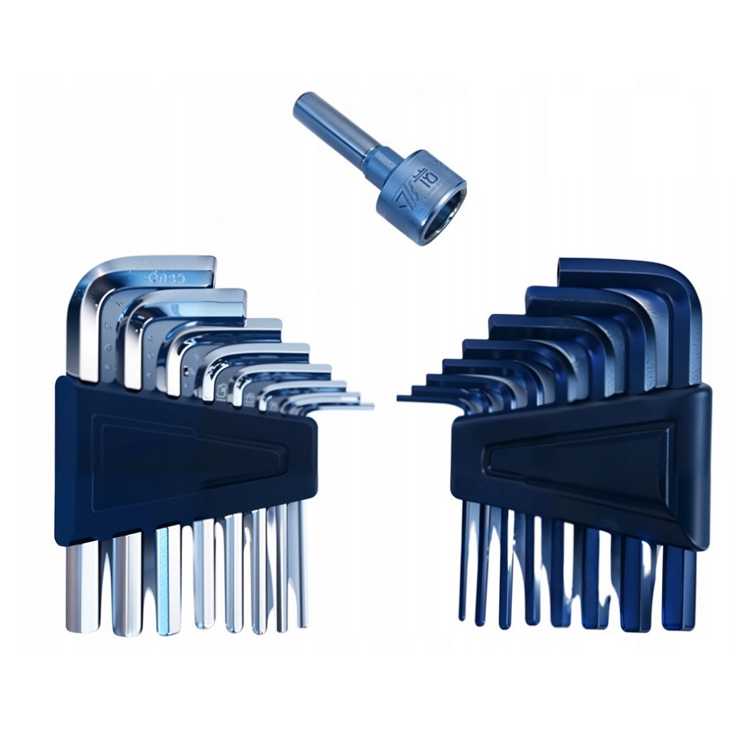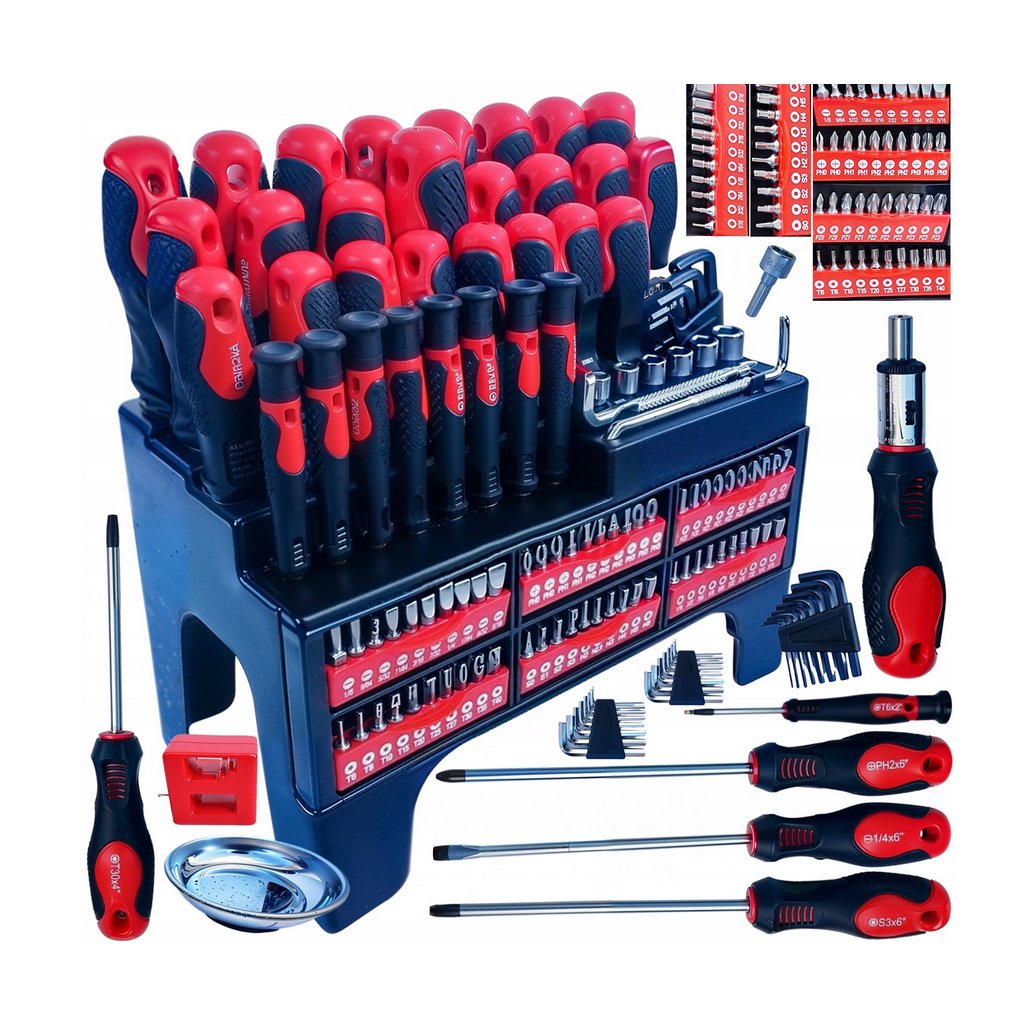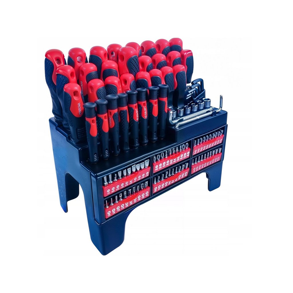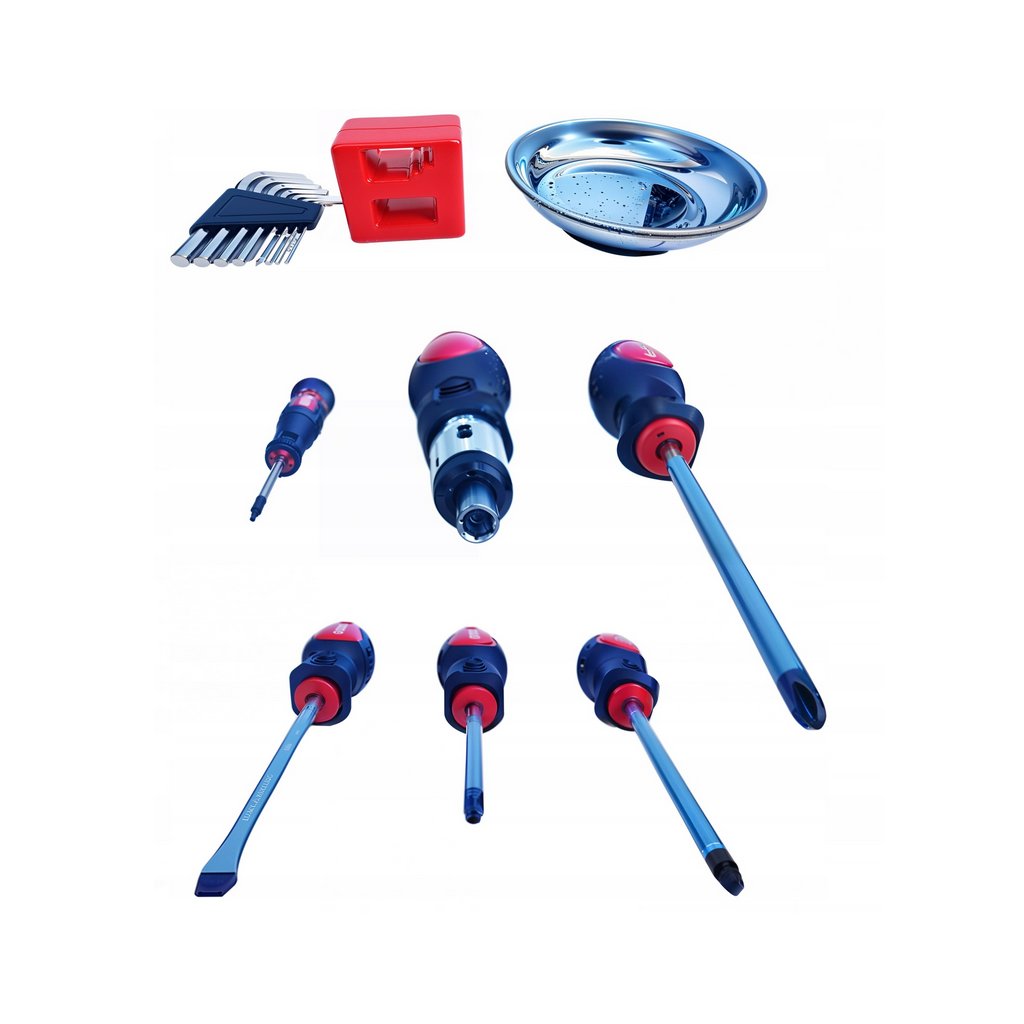 Sada obsahuje: šroubováky, klíče, bity, stojan, magnetická miska