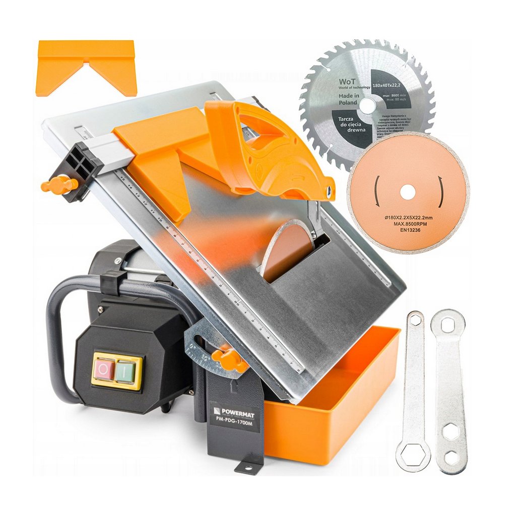 Napájení (V / Hz);230/50Maximální výkon (W);1700otáčky naprázdno (ot./min.);2950Hloubka řezu (90°) (mm);34Hloubka (15°) (mm);18Rozměr pracovního stolu (mm);360 x 330Maximální úhel řezu;45°Velikost disku;180 mm x 22,2 mm x 2,2 mmMaximální rozměr dlaždic;500 mm x 500 mmHladina akustického výkonu Lion;105 dB (A) k = 3 dB (A)Hladina akustického tlaku Lpa;92 dB (A) k = 3 dB (A)Třída ochrany;IIStupeň krytí;IP54hmotnost (kg);7