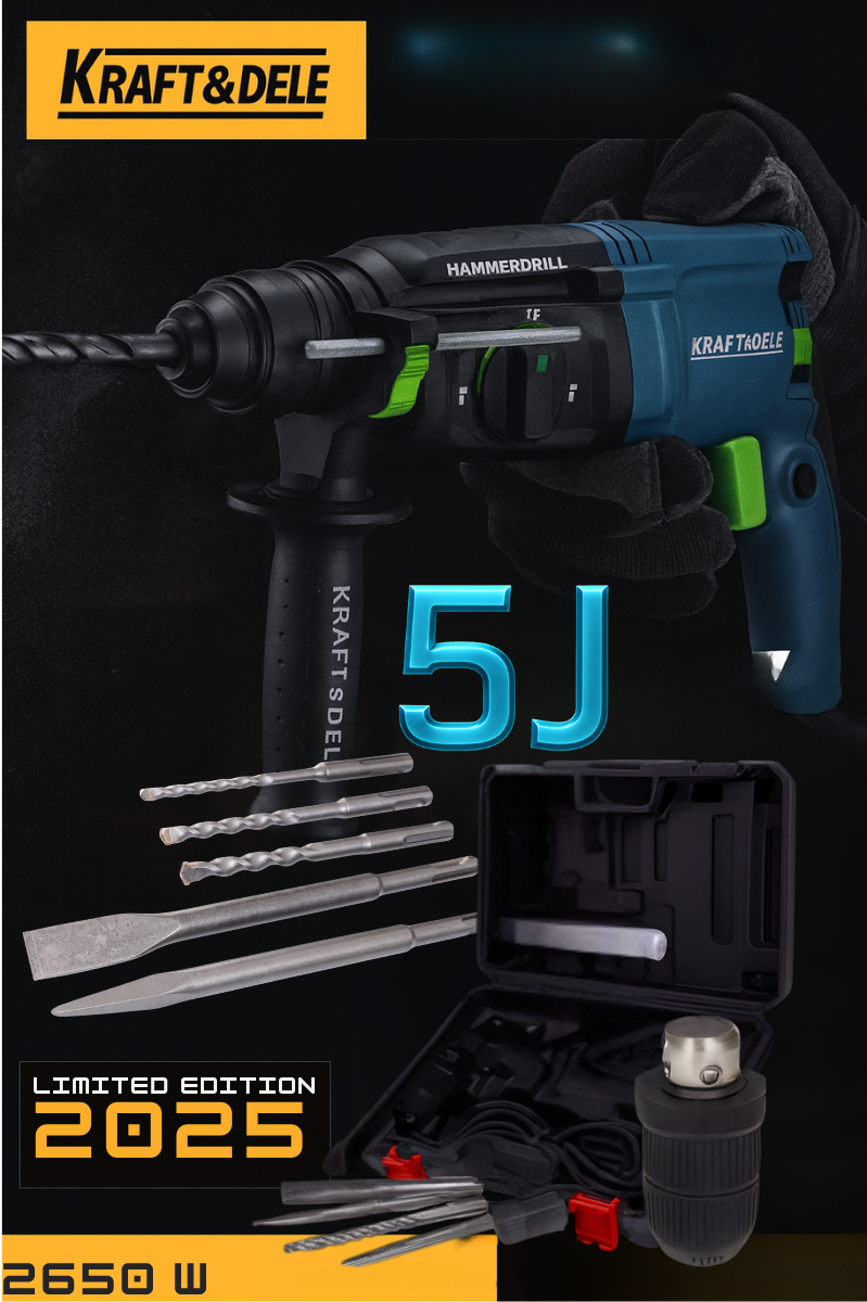 - Vrtací a sekací kladivo Kraft 2650 W, 5 J, SDS-Plus, kufr + příslušenství – výkon, přesnost a pohodlné ovládání