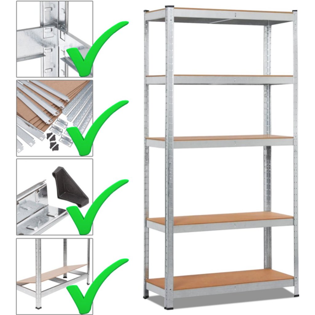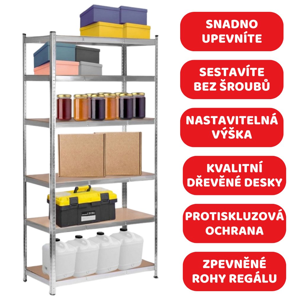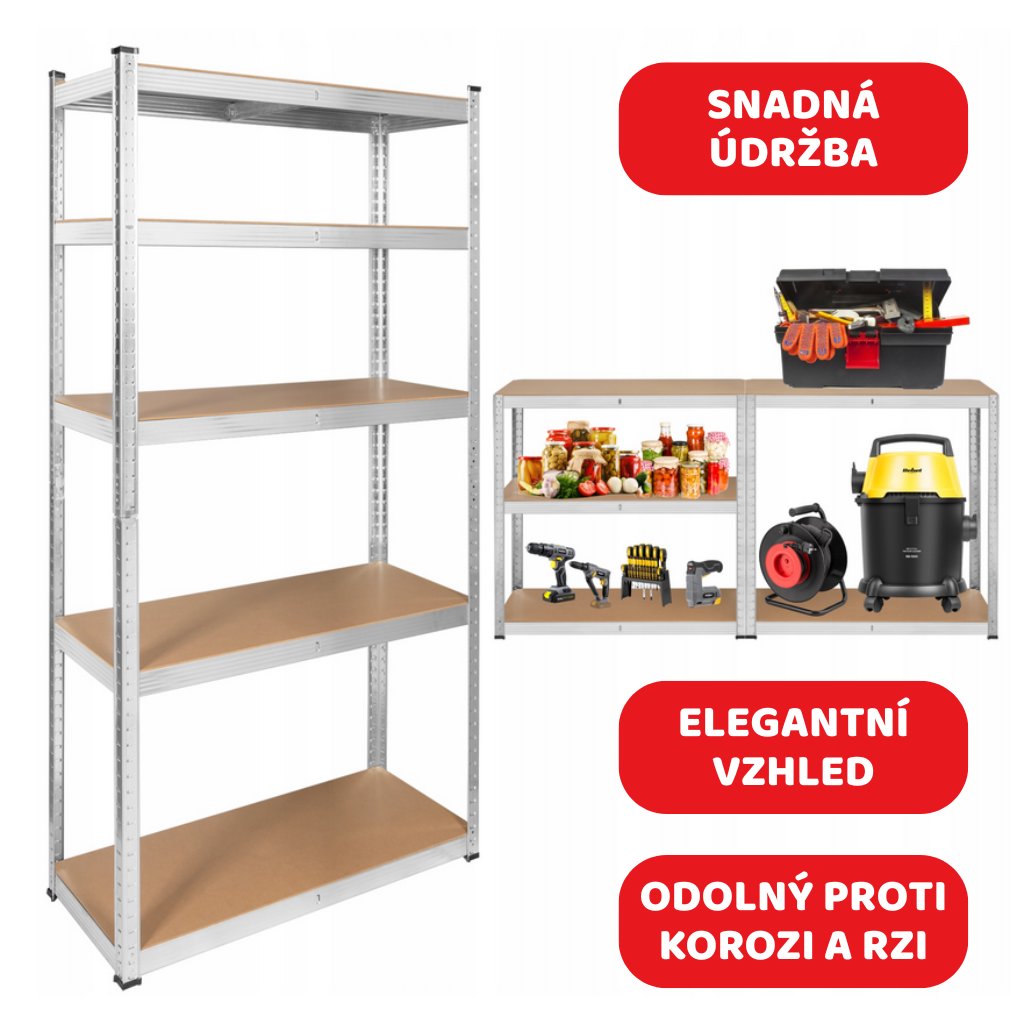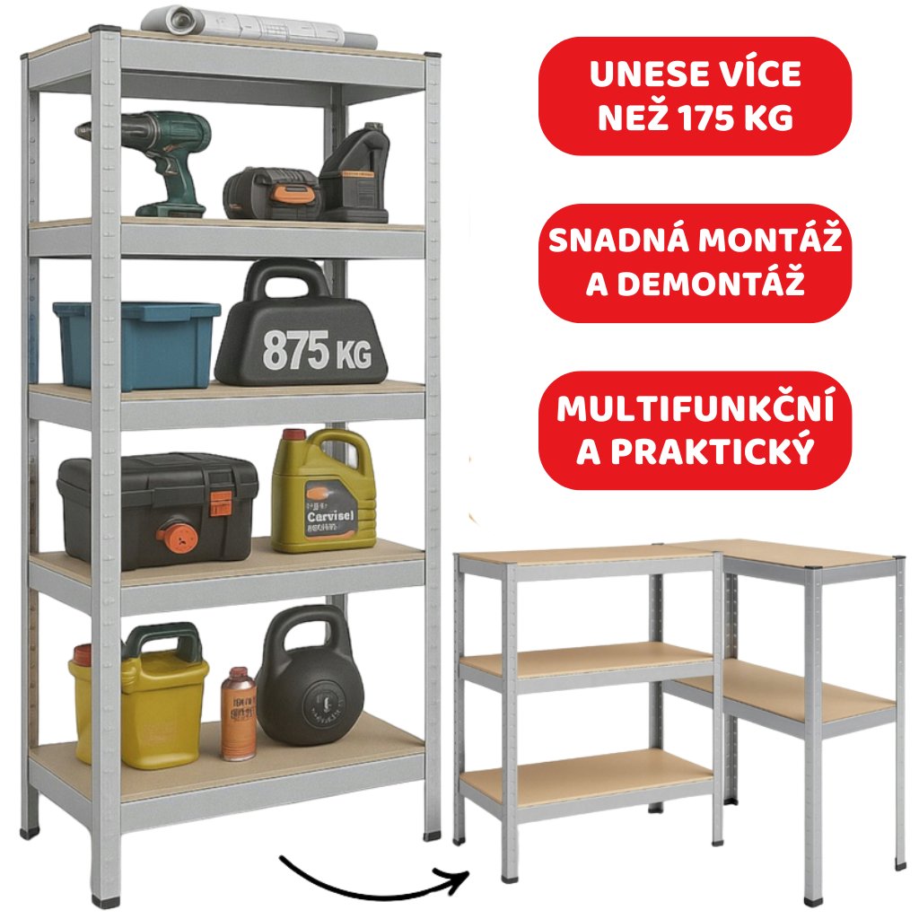 5 polic a vysoká nosnost pojme vše - od nářadí po sezónní věci. Konec skládání do kouta nebo krabic pod stolem. Ideální pro ukládání všeho – od knih, přes nářadí, až po domácí potřeby.
