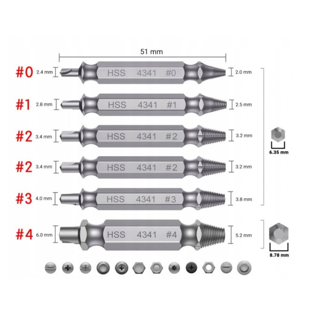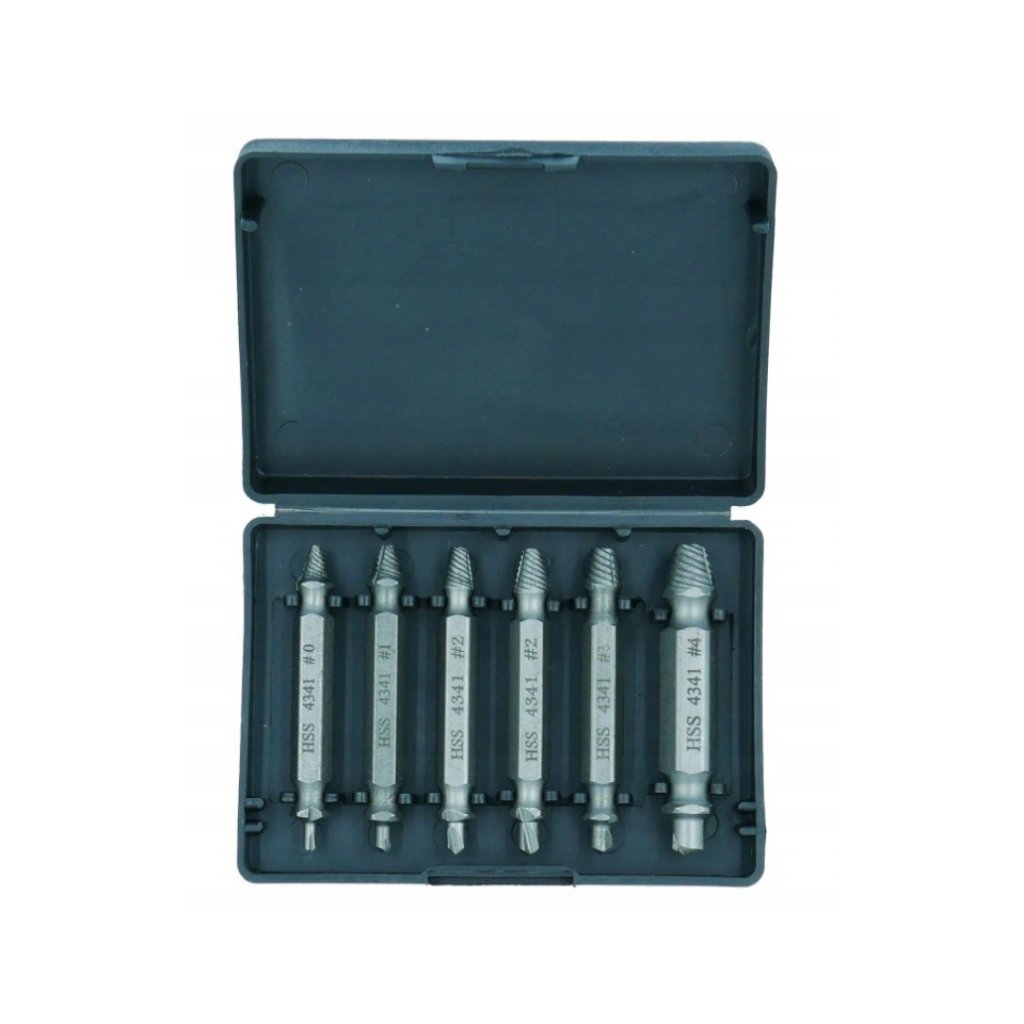 Sada vytahováků zalomených šroubů (6 ks) je nástrojová sada určená k bezpečnému a efektivnímu odstranění zalomených nebo poškozených šroubů