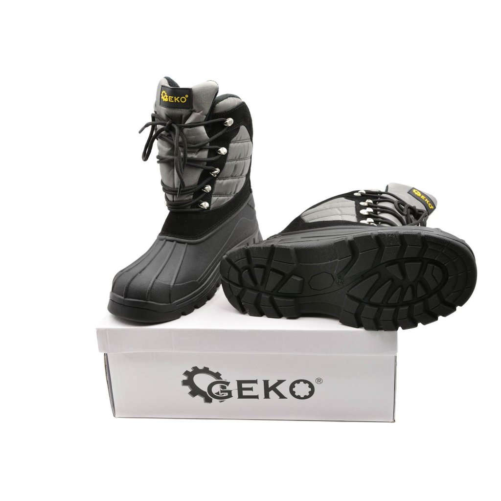 Vodotěsné boty „sněhule” renomované značky GEKO. Spodní část svršku a podešev jsou vyrobeny z vysoce kvalitního termokaučuku, který se vyznačuje velmi dobrou přilnavostí a díky své vysoké elasticitě neomezuje pohyby a neklade odpor při ohýbání.