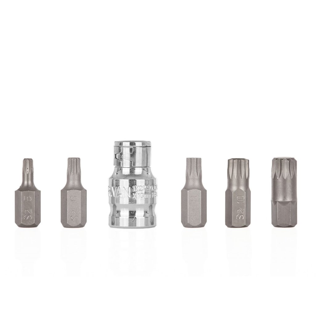 Sada klíčů SPLINE M5-M12 s adaptérem 1/2”. Bity v pěti různých velikostech umožňují provádět specializované práce v autoservisech a mechanických dílnách. Klíče jsou vyrobeny z vysoce kvalitní oceli S2, která se vyznačuje vysokou mechanickou pevností a velmi dobrou odolností proti kroucení, což z ní činí ideální materiál pro výrobu mimo jiné klíčů. Součástí sady klíčů je adaptér s 10mm šestihranným držákem, který je kompatibilní s 1/2" ráčnou.