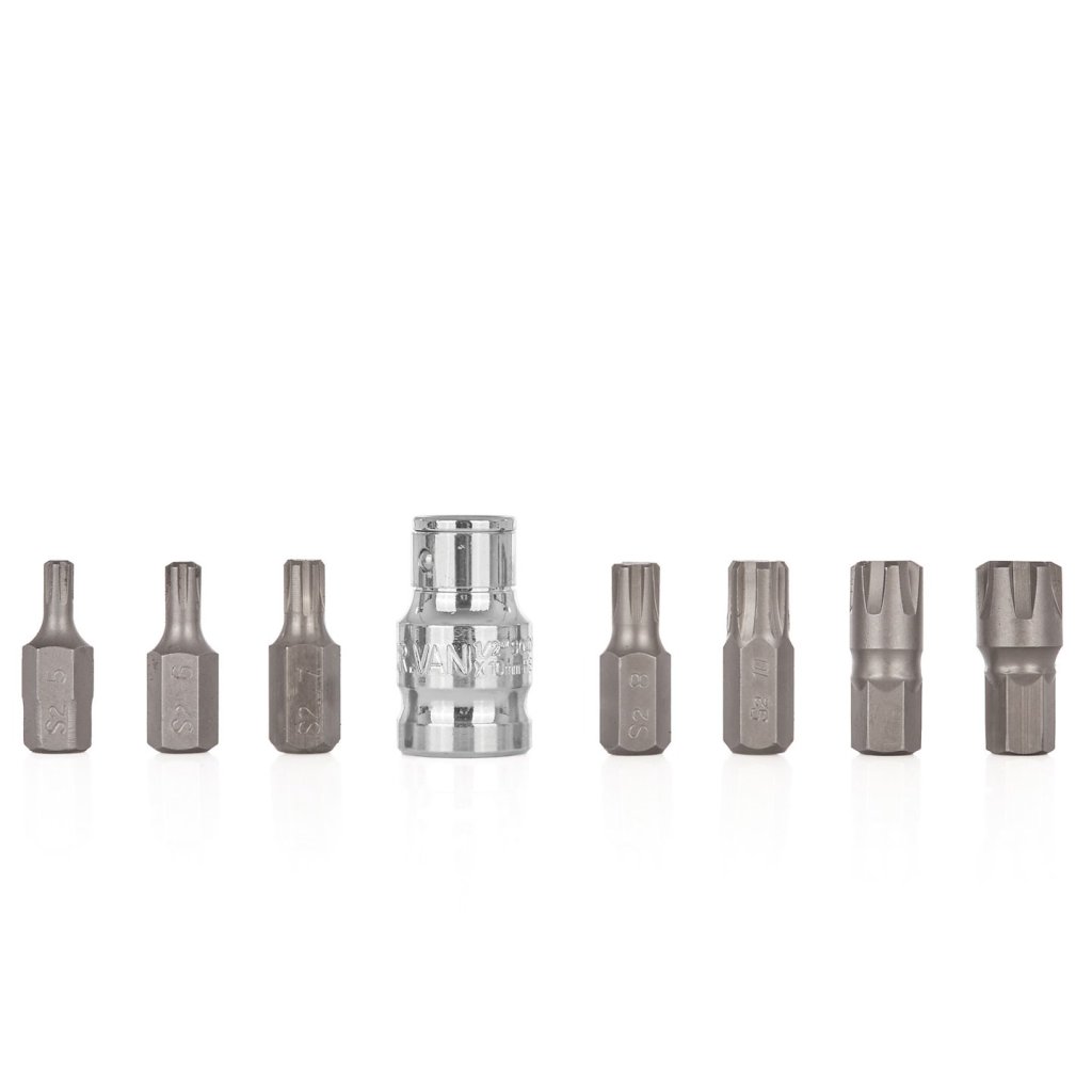 Sada stopkových klíčů RIBE M5-M14 s adaptérem 1/2”. Bity v sedmi různých velikostech umožňují provádět specializované práce v autoservisech a mechanických dílnách. Klíče jsou vyrobeny z vysoce kvalitní oceli S2, která se vyznačuje vysokou mechanickou pevností a velmi dobrou odolností proti kroucení, což z ní činí ideální materiál pro výrobu mimo jiné klíčů. Součástí sady klíčů je adaptér s 10mm šestihranným držákem, který je kompatibilní s 1/2” ráčnou.