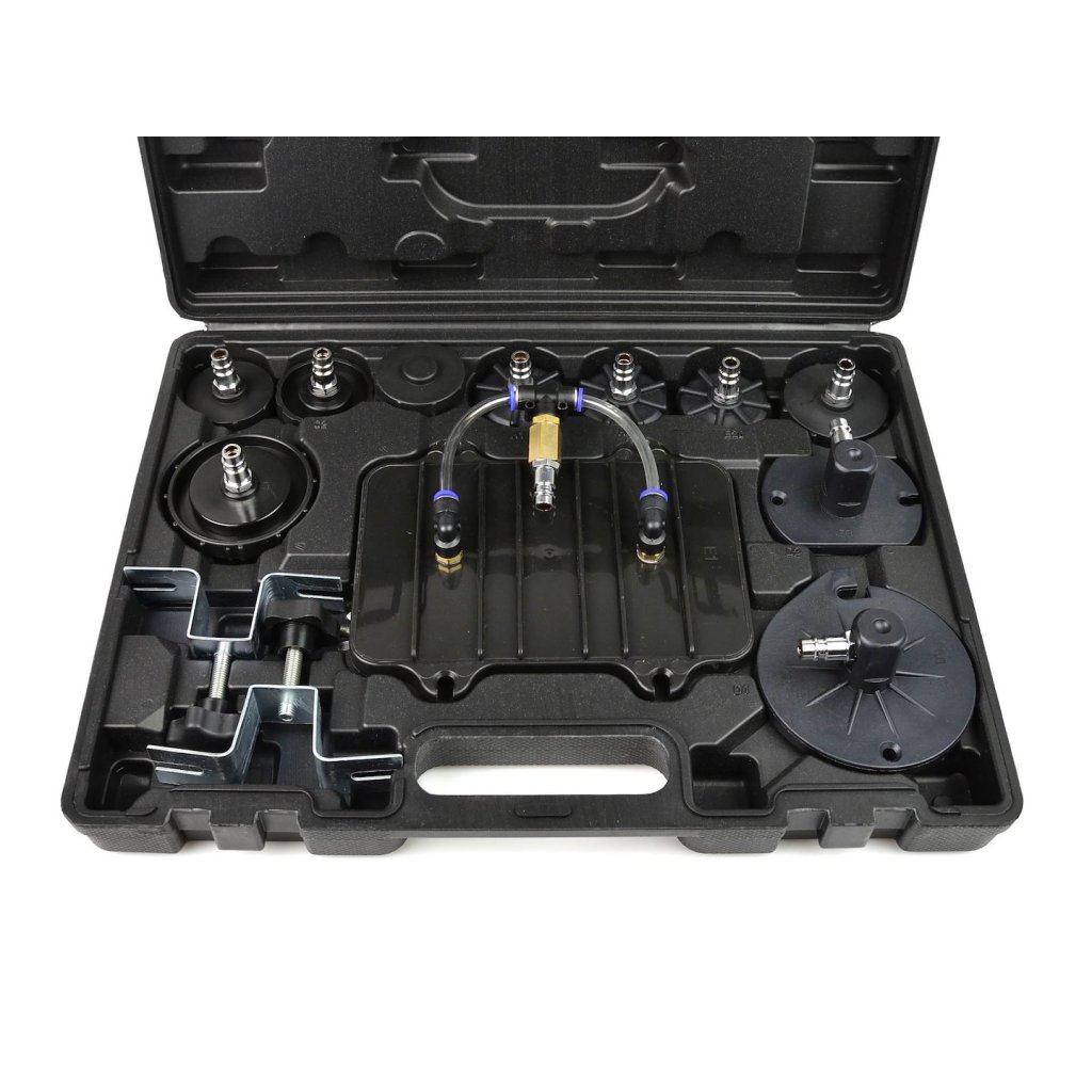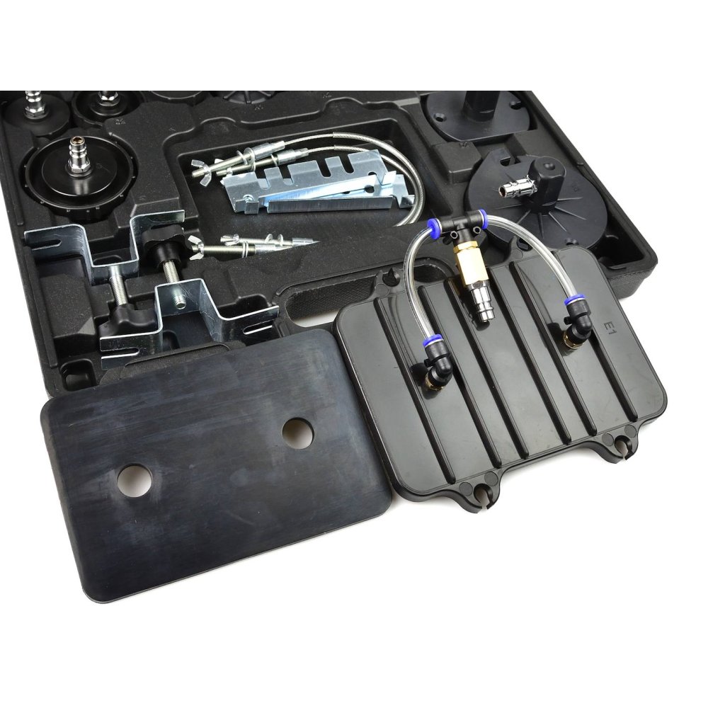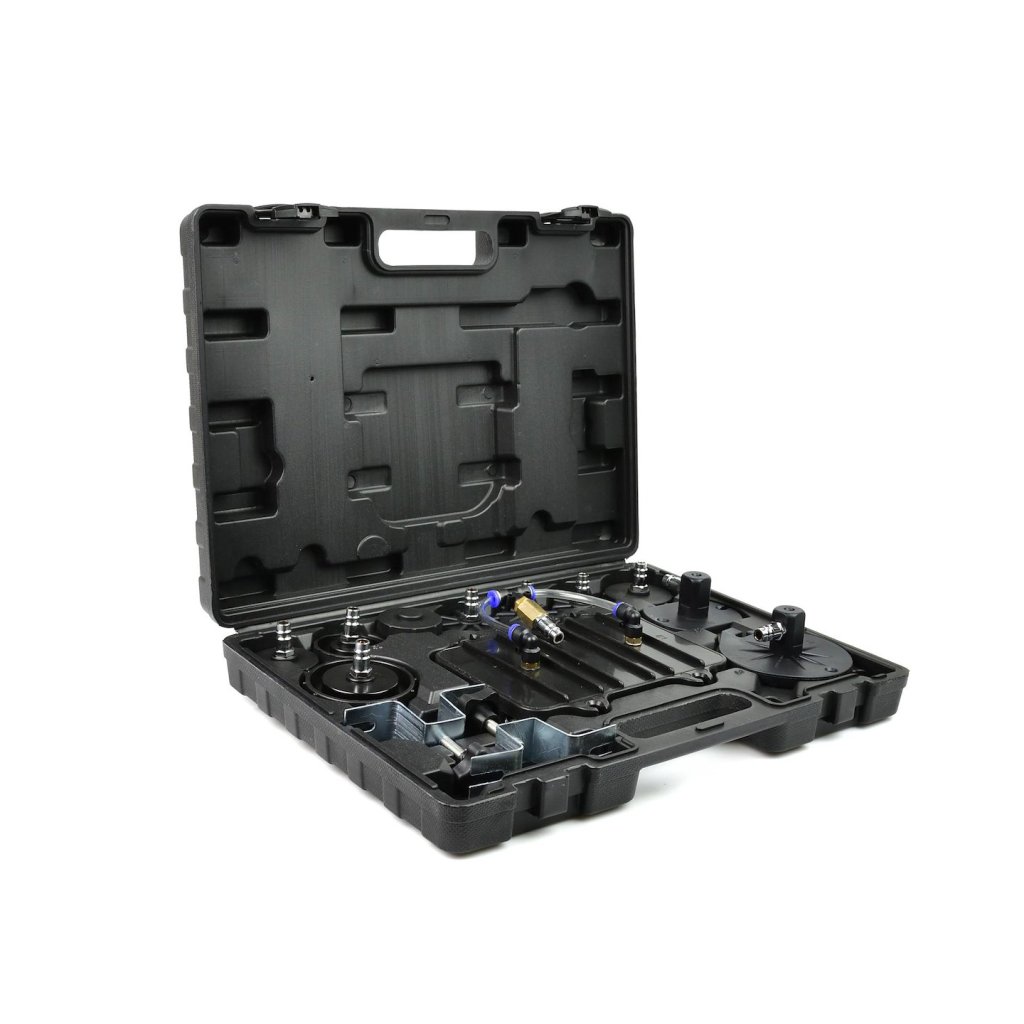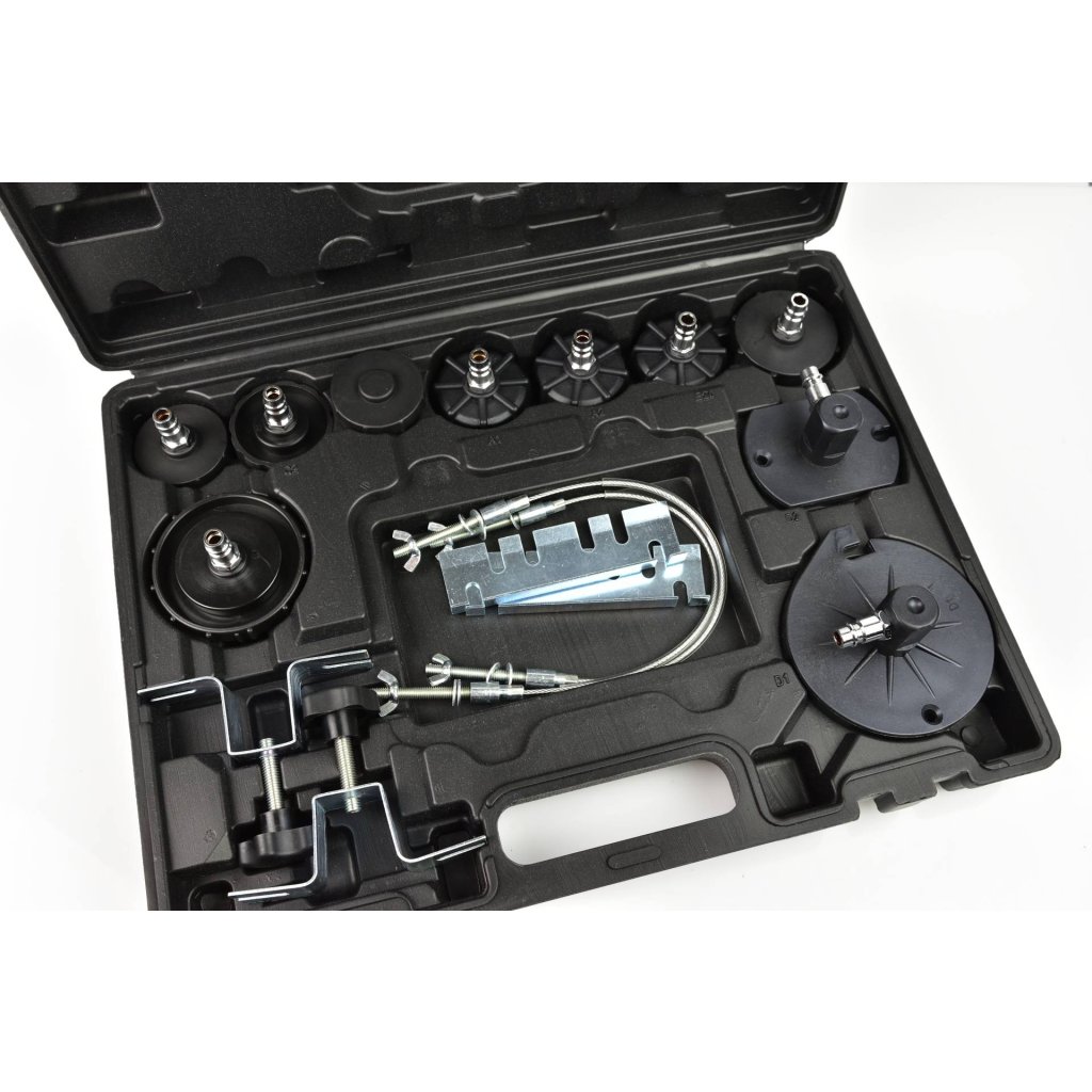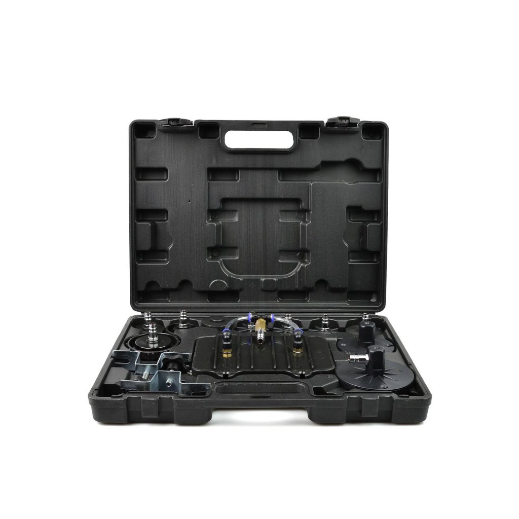 Sada pro údržbu brzdového systému. Nářadí umožňuje jedné osobě snadno a rychle vyměnit kapalinu v brzdovém systému a hydraulické spojce. Sada také umožňuje rychlé odvzdušnění brzdového systému. Součástí zařízení je praktický kufřík se sadou adaptérů, které umožňují údržbu většiny brzdových systémů.