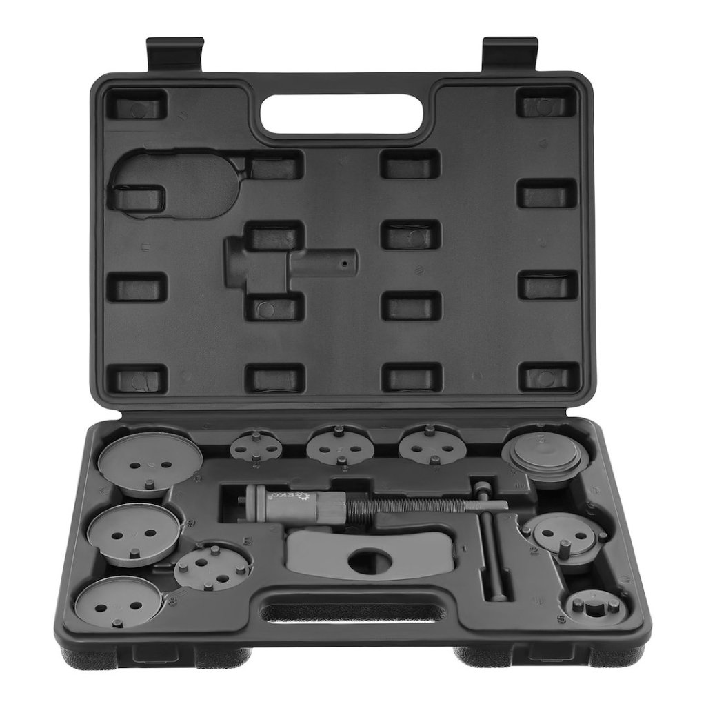 Profesionální 12dílná sada pro vytahování / lisování brzdových pístů, nezbytná při opravách vozidel vybavených kotoučovými brzdami.