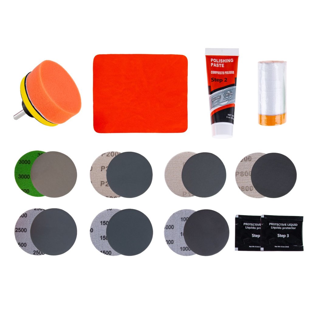 - Brusné papíry pro broušení světlometů: 2 x P800, 2 x P1000, 2 x P1200, 2 x P1500, 2 x P2000, 2 x P2500, 2 x P3000 Sada zrnitostí umožňuje důkladné odstranění nečistot, zažloutnutí a mikroškrábanců.