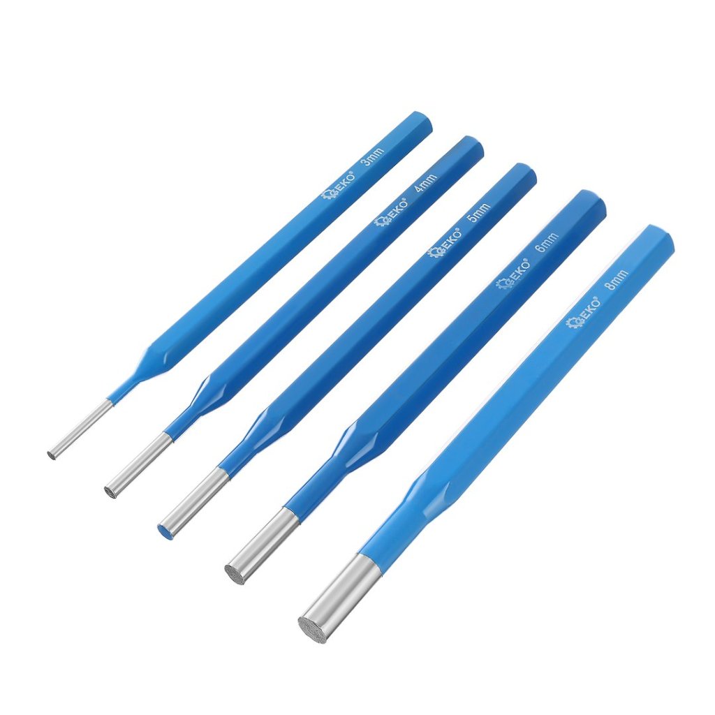 Sada sekáčů, vysekávačů a důlníků z chrom-vanadové oceli. Nástroje vhodné mimo jiné pro značení středu otvorů před vrtáním, pro řezání plechů a tyčí a vysekávání kovových prvků.
