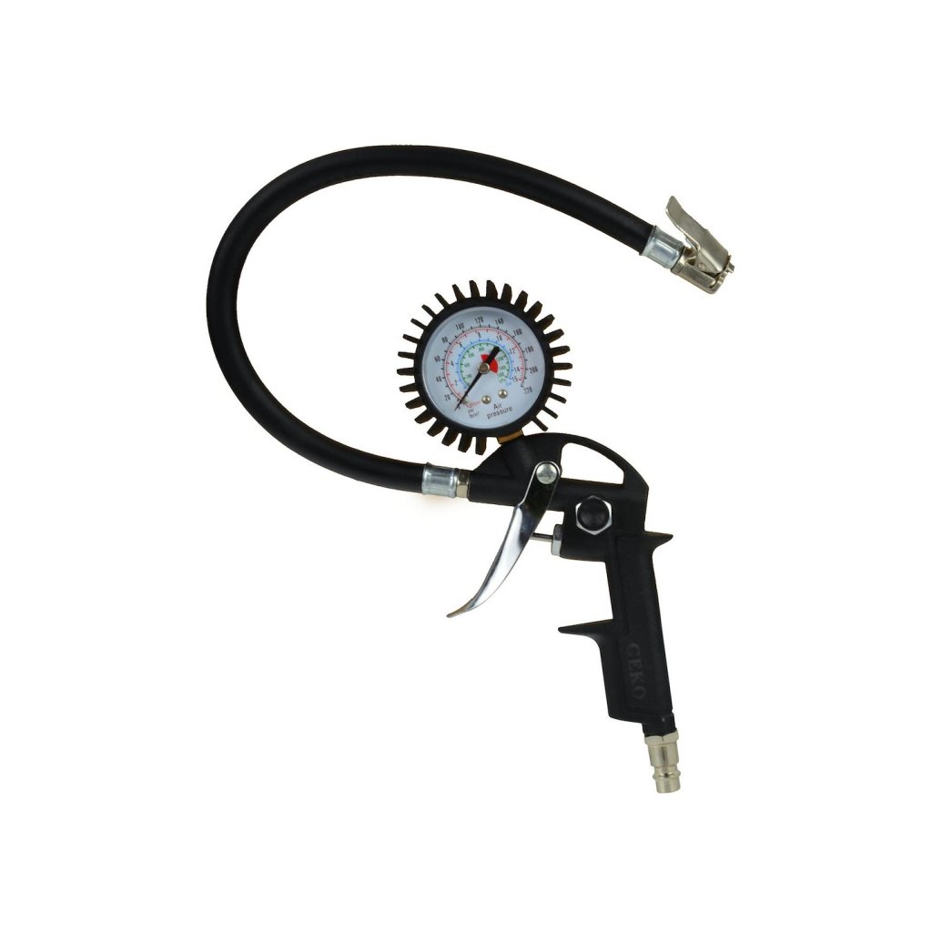Pistole s koncovkou a manometrem pro huštění kol