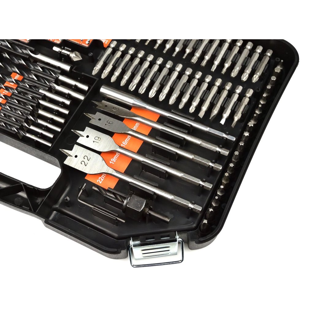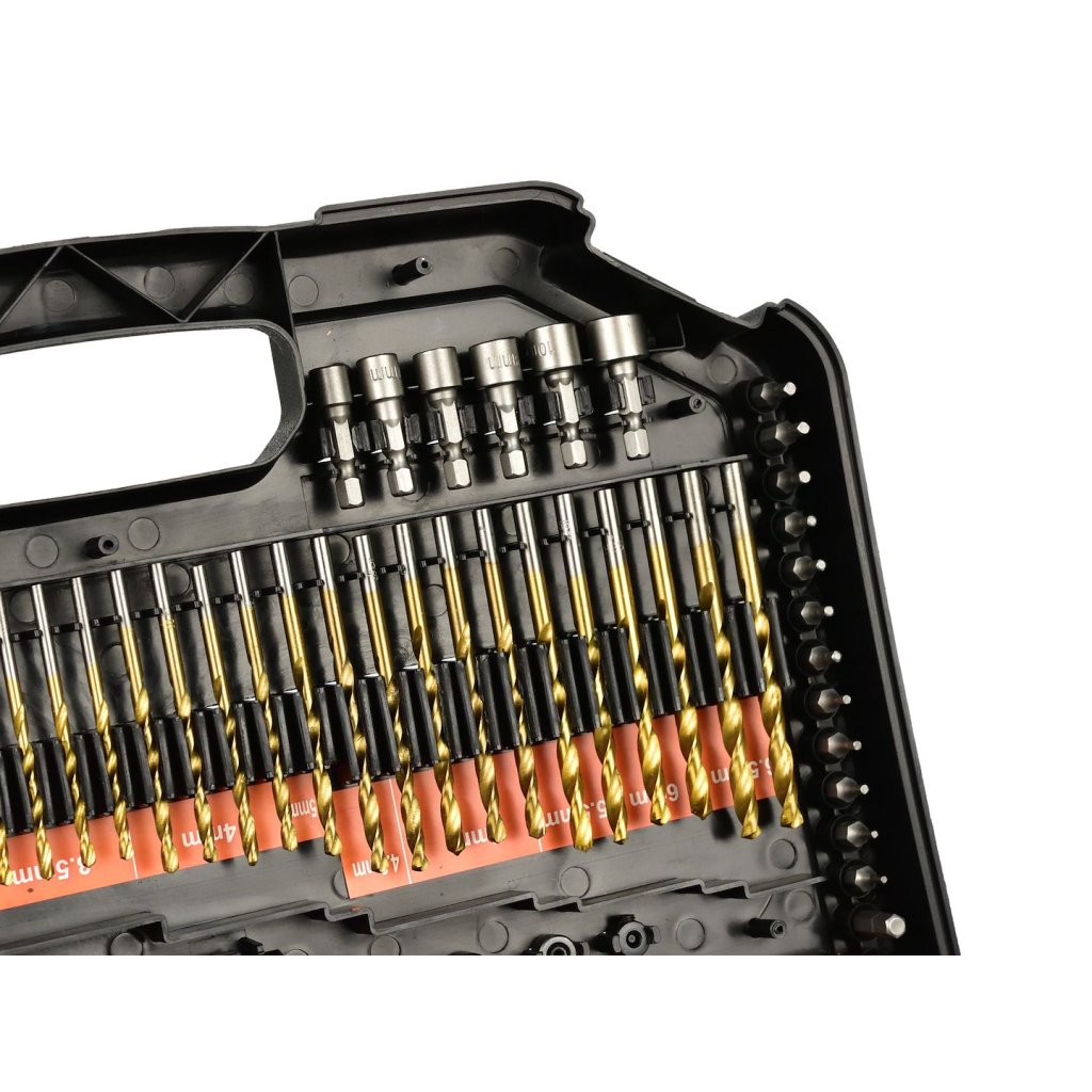 Rozsáhlá sada vrtáků, bitů, děrovek a nástavců pro šroubovák. Sada najde uplatnění v každé dílně domácího kutila. Celá sada je zabalena v praktickém plastovém kufříku.