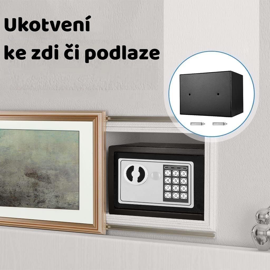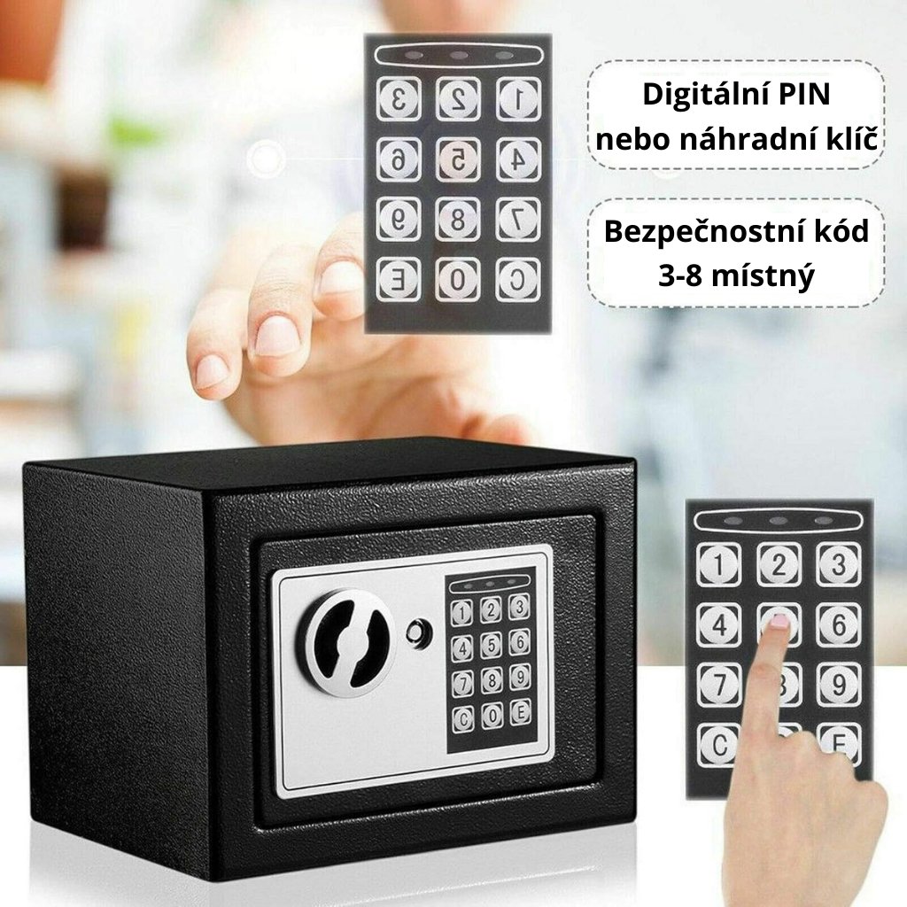 🔢 PIN 3–8 číslic + 🗝️ 2 klíče • 🔧 Kotvení ke zdi i podlaze • 🔋 LED signalizace • ⏱️ blokace po 3 chybách