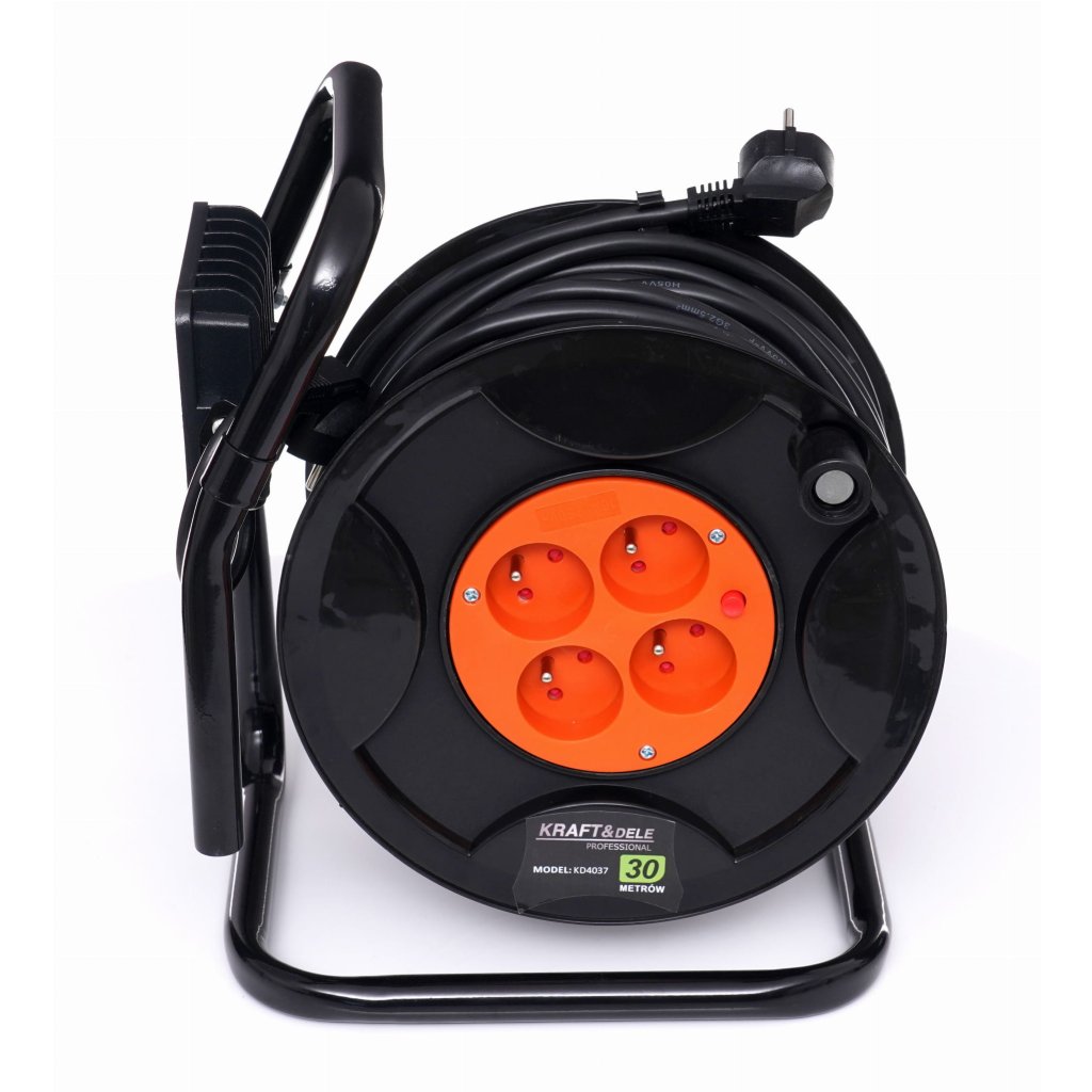 - Bubnový prodlužovací kabel 30 m s LED reflektorem 20 W , 3×2,5 mm², 4 zásuvky, kovový buben – výkon, přesnost a pohodlné ovládání