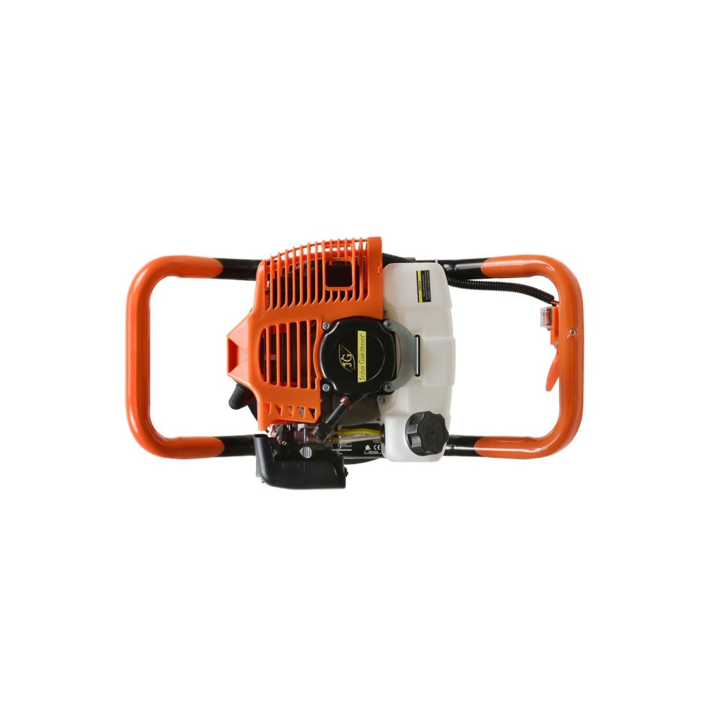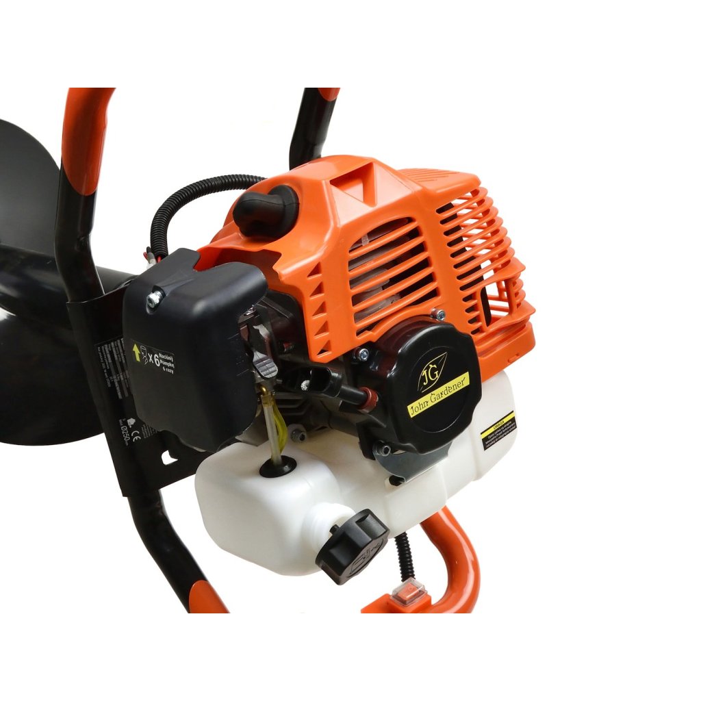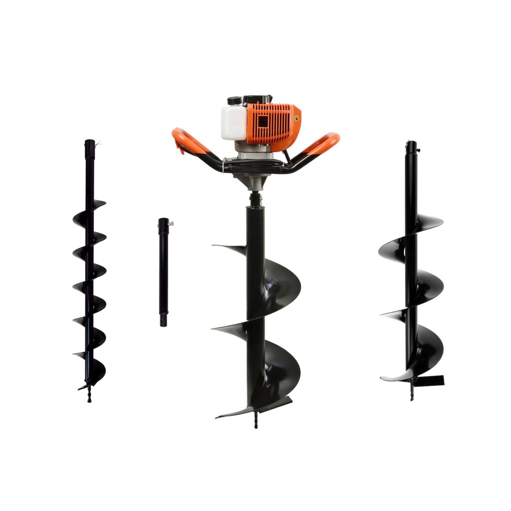 Benzinový vrták do půdy s nominálním výkonem 1,4 kW. Vrták v sadě s vrtáky o průměru 10, 20, 30 cm a s prodloužením 50 cm.