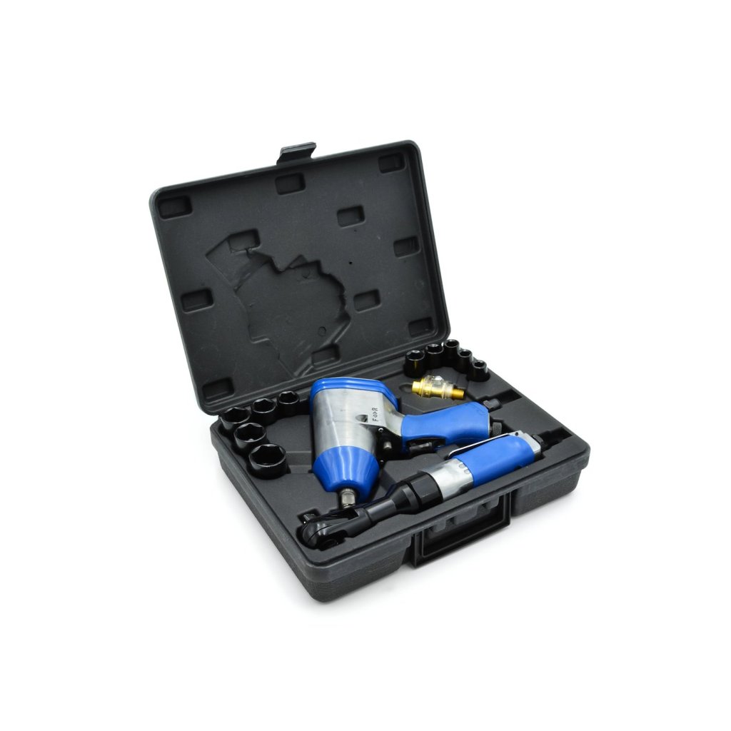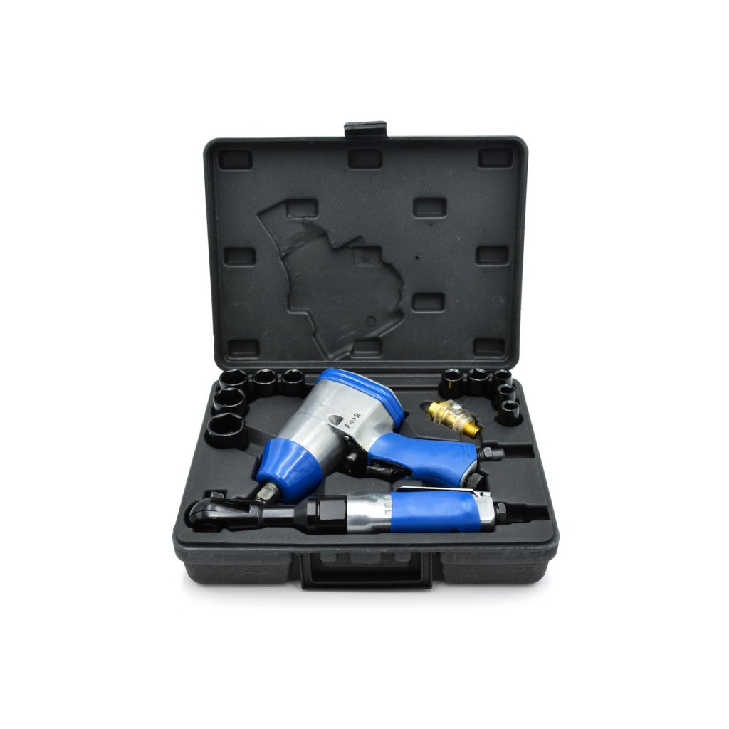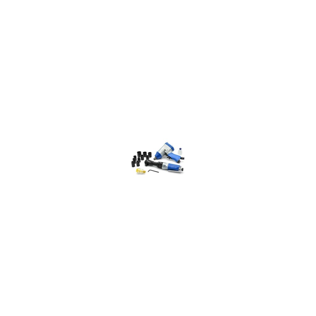 14dílná sada pneumatických nástrojů. Sada obsahuje: pneumatický klíč 1/2", pneumatickou ráčnu 1/2", olejovač a sadu nástavců.