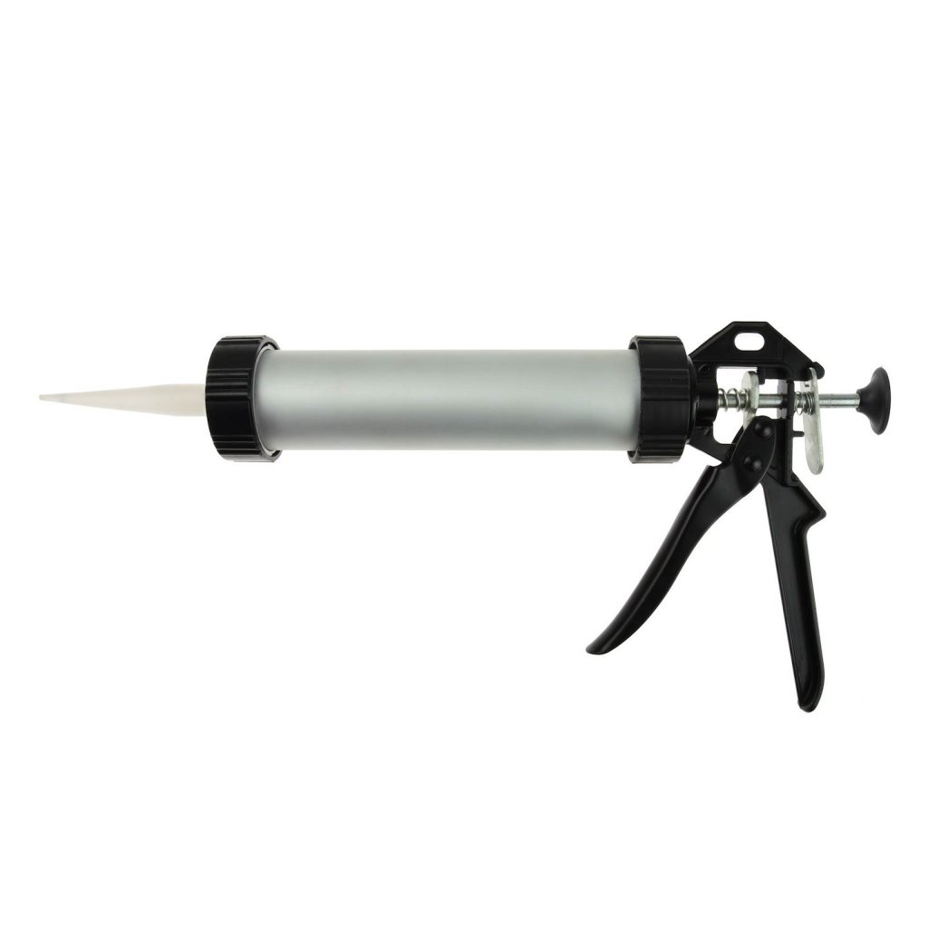 Výtlačná pistole na hmoty ve folii a kartuších. Výtlačná pistole má lože a píst vyrobené z oceli a tělo a rukojeť vyrobené z hliníku.