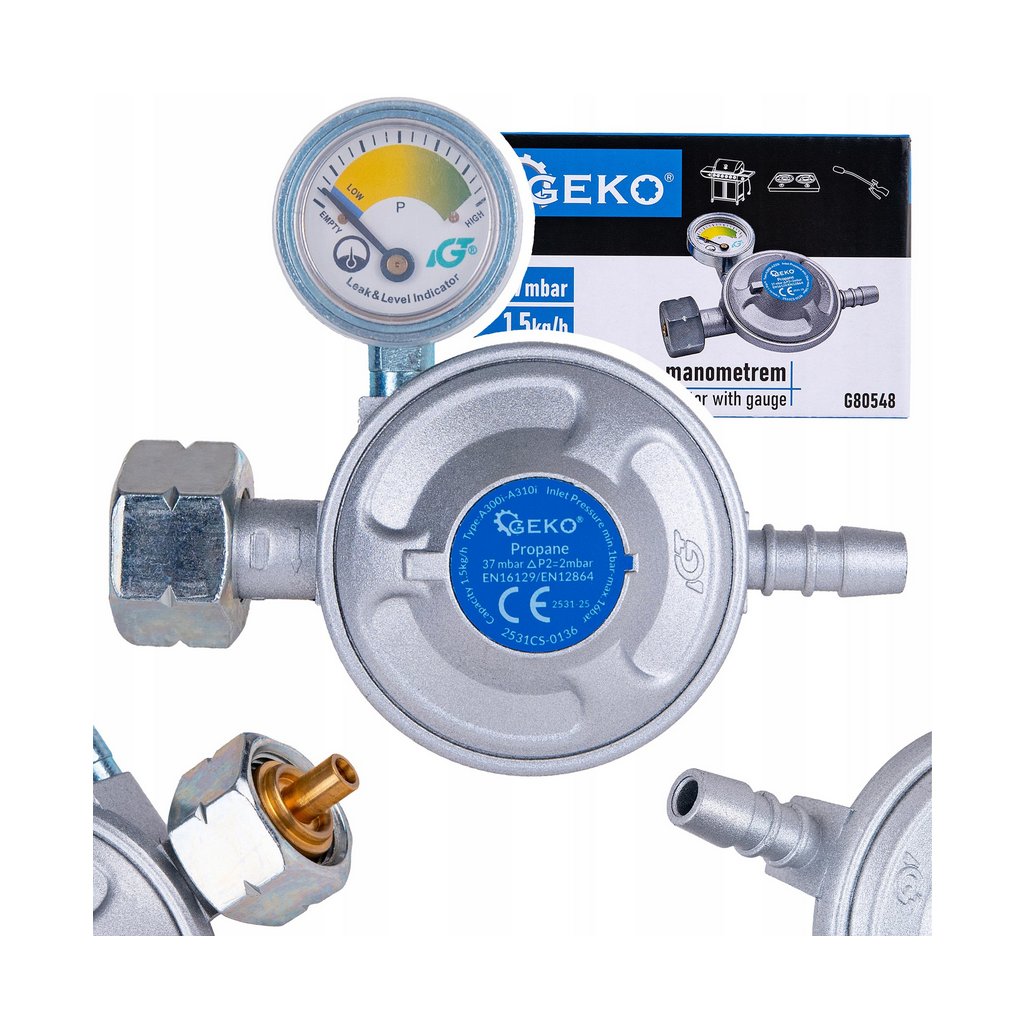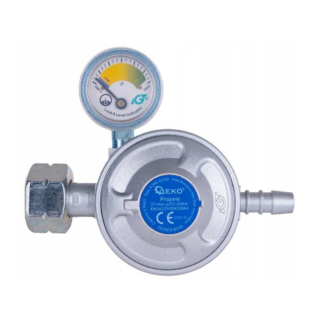 - Plynový regulátor s manometrem k propan-butanové lahvi 37 mbar, 1,5 kg/h – výkon, přesnost a pohodlné ovládání
