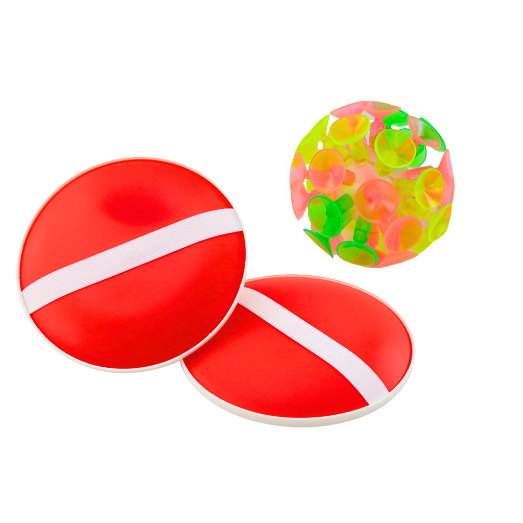 - Hra dovednostní kulaté pálky míček s přísavkami červený je skvělým doplňkem pro každou sbírku venkovních her