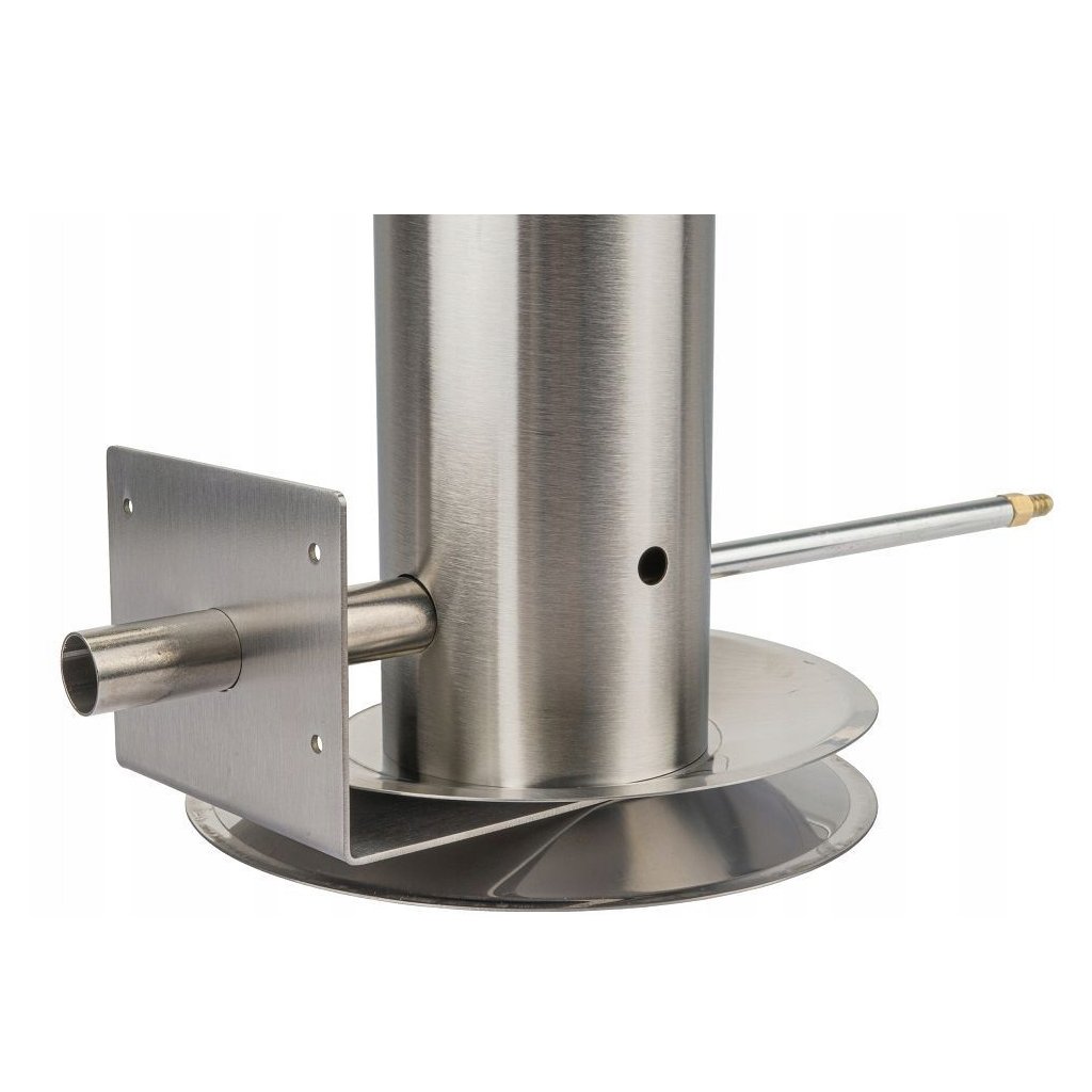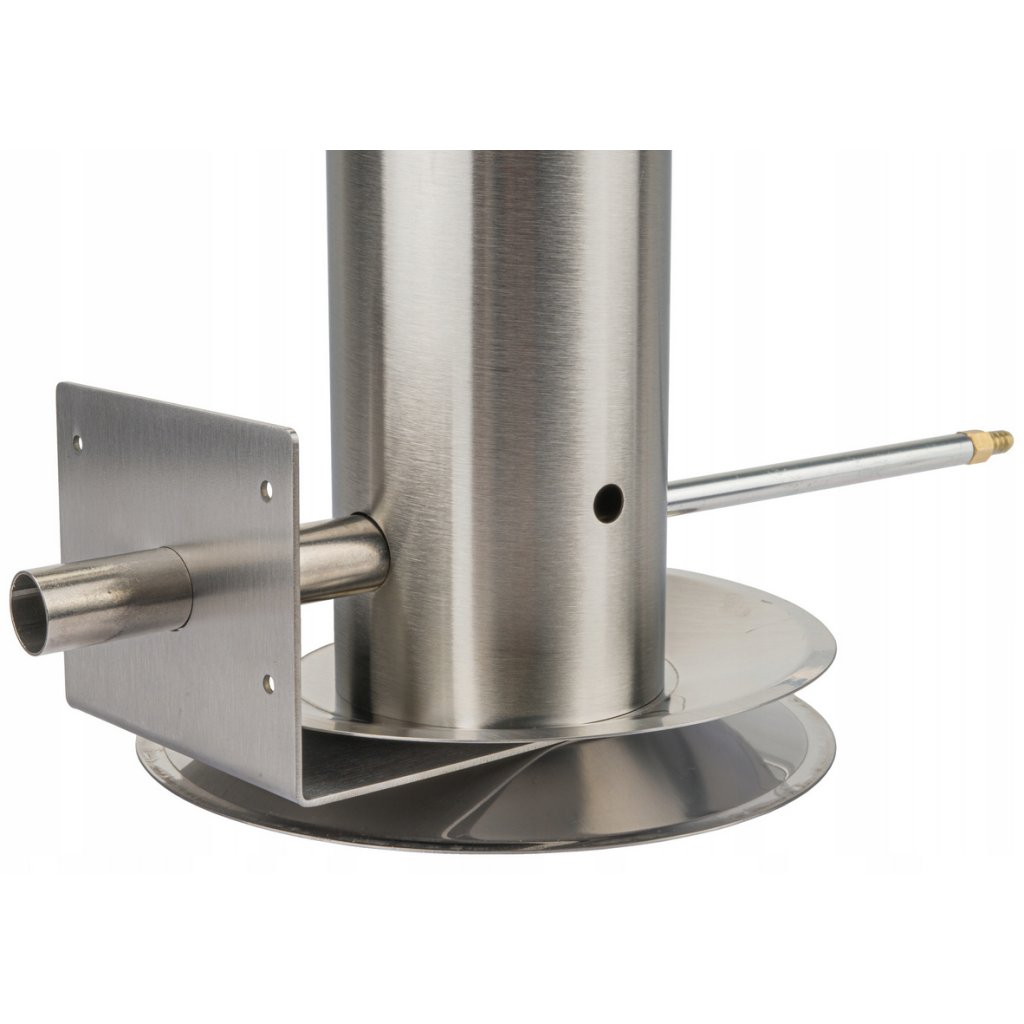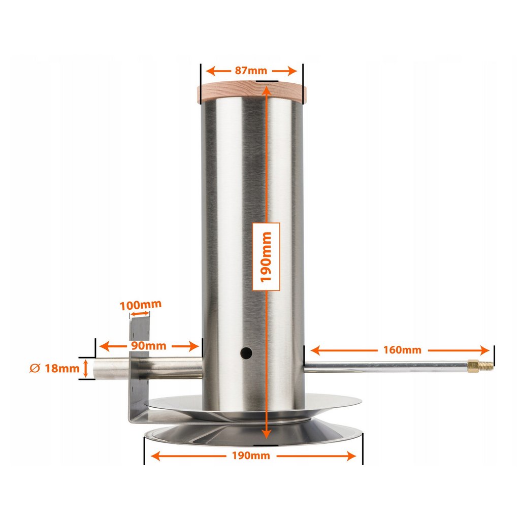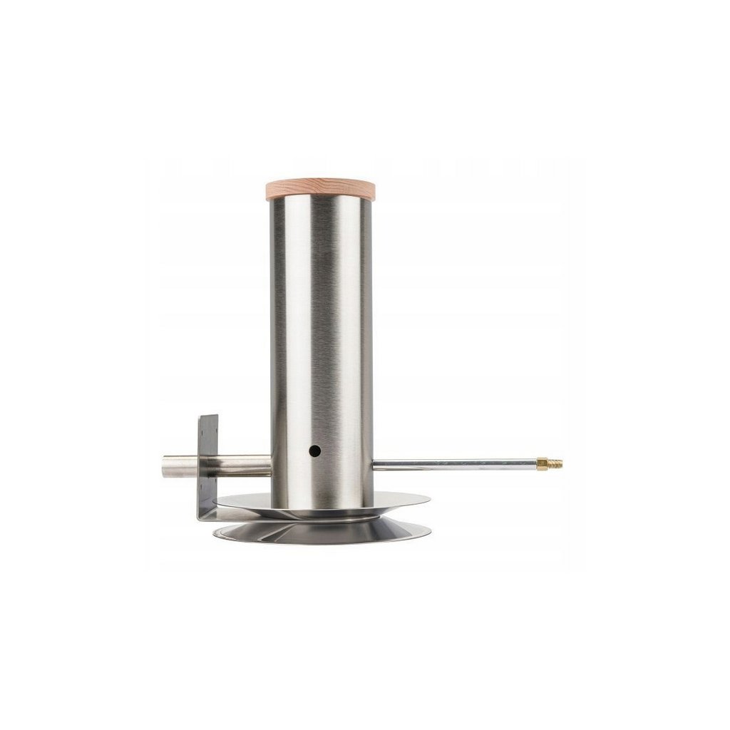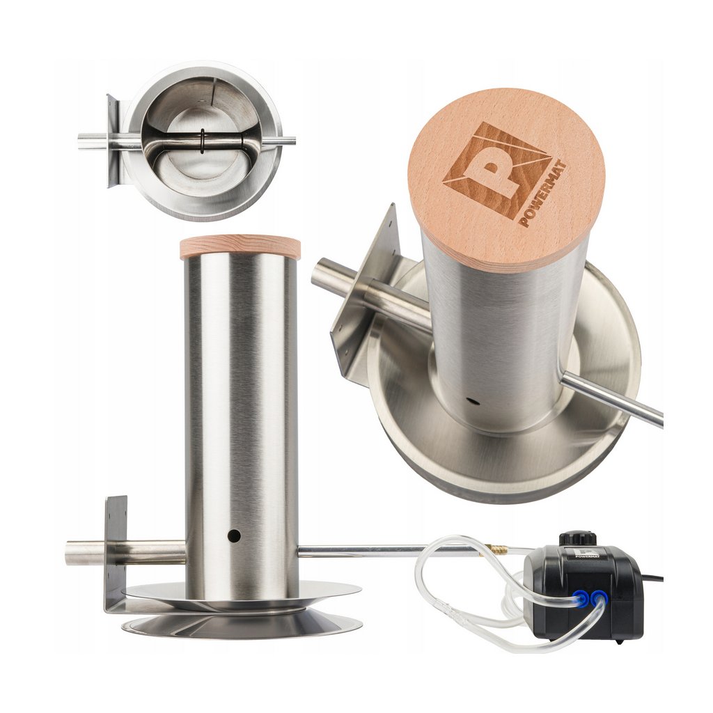 Spolehlivý zadýmovač pro studené i teplé uzení s regulací přívodu vzduchu. Tělo z nerezové oceli a dřevěné víko chrání štěpky před vlhkostí. Elektrická vzduchová pumpa 230 V / 4 W (výkon 2× 3,5 l/min) zajišťuje plynulý a stabilní kouř. Zásobník 1,1 l vystačí typicky na 3–4 hodiny kouře (podle podmínek a frakce štěpek). Krytí IPX4, pracovní teplota −5 až +45 °C.