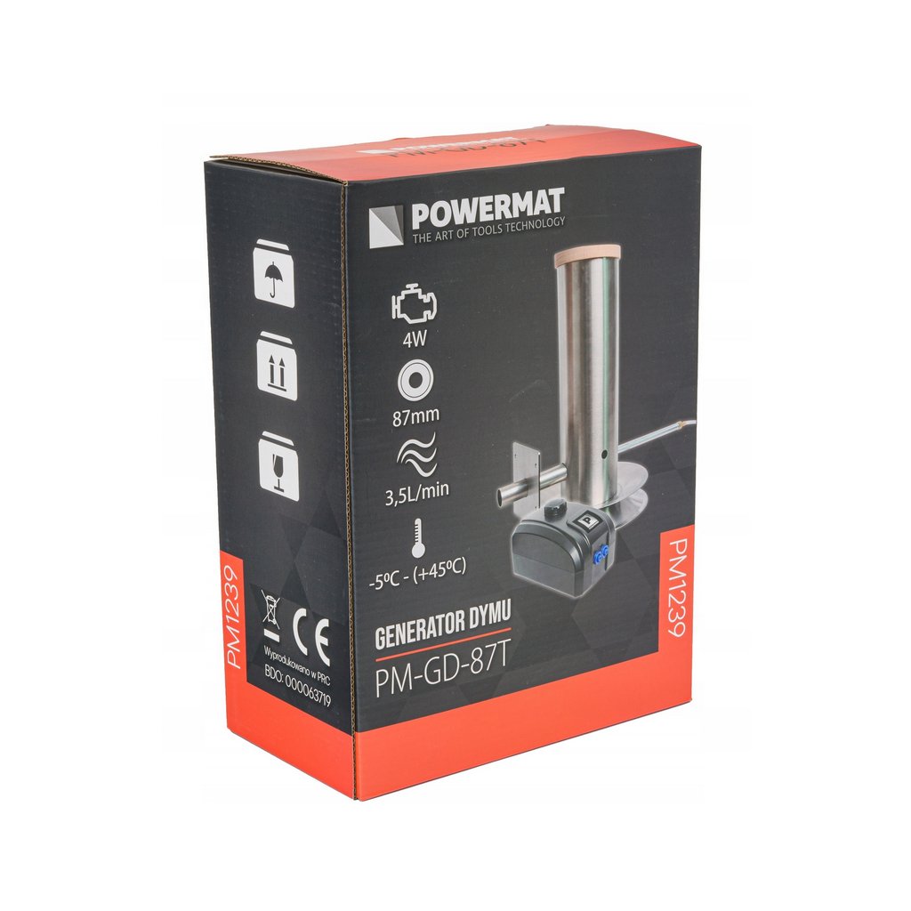 Kompaktní zadýmovač pro studené i teplé uzení. Nerezový válec s dřevěným víkem, elektrická pumpa 230 V/4 W s výkonem 2 × 3,5 l/min, objem zásobníku 1,1 l – až 3–4 hodiny kouře na jedno naplnění. Krytí IPX4, pracovní teplota −5 – +45 °C