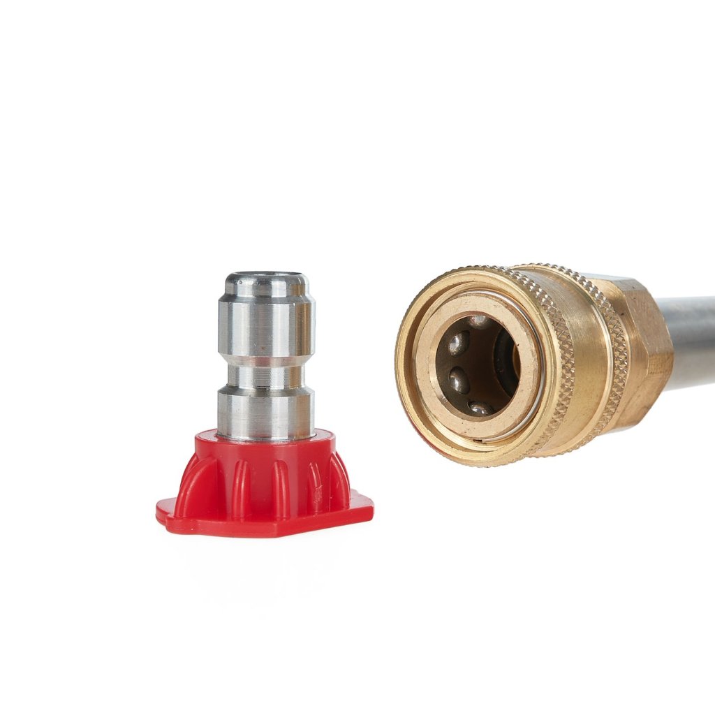 - Červená tryska (0°):; Ideální pro čištění těžko přístupných míst a štěrbin, kde je vyžadováno přesné zaměření proudu na malou plochu.