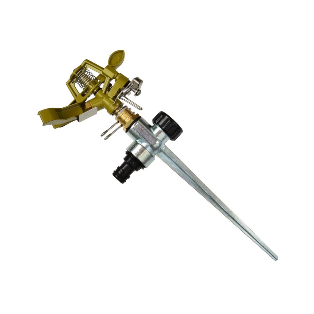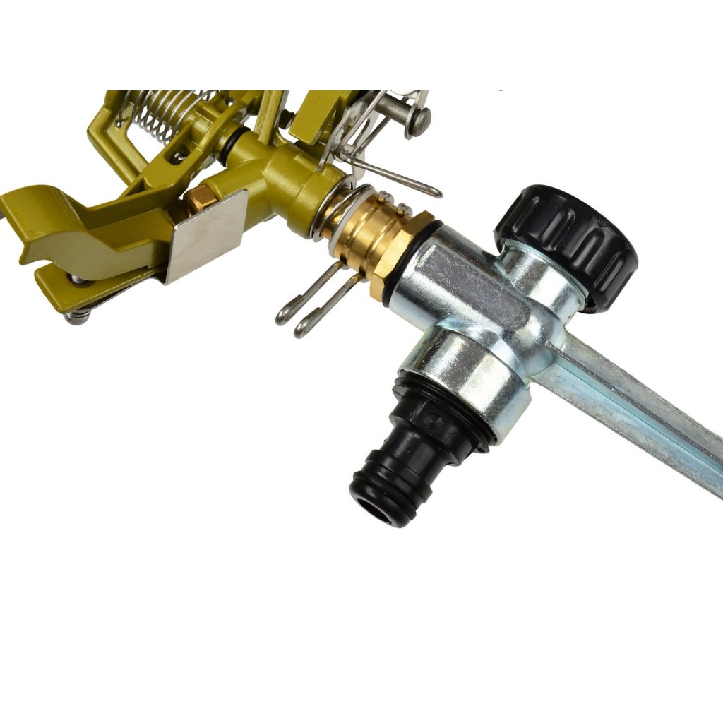 Robustý kovový pulzní zavlažovač. Průměr zavlažování je maximálně 24 m, v závislosti na tlaku proudu vody. Zavlažovač je vybaven adaptérem, který umožňuje rychlé a snadné připojení hadice povýkoní rychlospojky. Zavlažovací plocha od 30 do 360° je…
