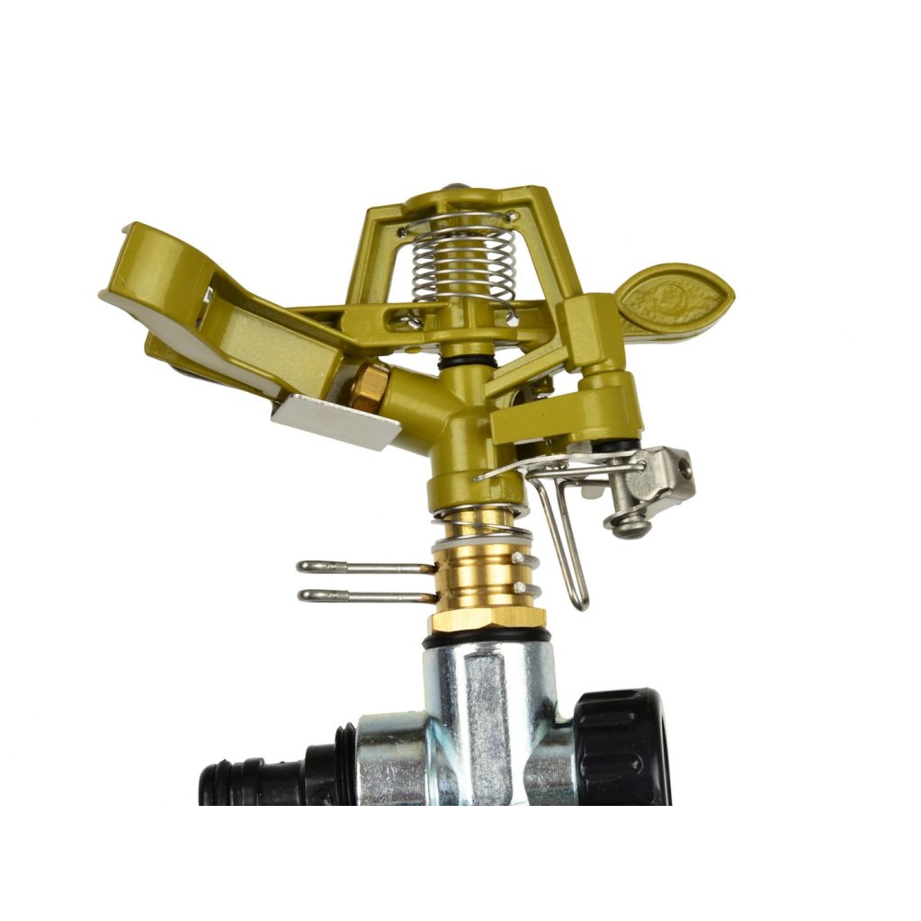 Robustý kovový pulzní zavlažovač. Průměr zavlažování je maximálně 24 m, v závislosti na tlaku proudu vody. Zavlažovač je vybaven adaptérem, který umožňuje rychlé a snadné připojení hadice povýkoní rychlospojky. Zavlažovací plocha od 30 do 360° je nastavitelná povýkoní dvou kroužků. Výjimečnou výhodou tohoto zavlažovače je tichý chod a efektivní proud vody. Regulovatelný proud vody podle potřeby – od proudu po rozptýlenou mlhu.